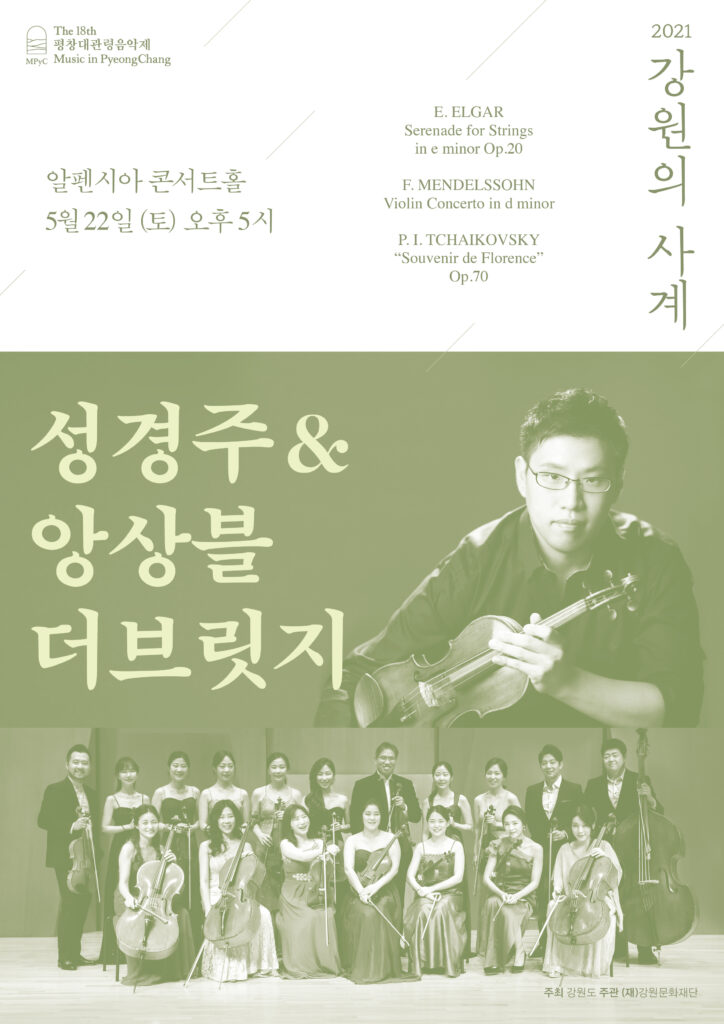 □ 강원도가 주최하고 강원문화재단(대표이사 김필국)이 주관하는 평창대관령음악제(예술감독 손열음)의 연중 프로그램 2021 <강원의 사계> 두 번째 메인공연인 ‘성경주 & 앙상블 더브릿지’가 5월 22일 (토) 오후 5시에 평창 알펜시아 콘서트홀에서 열린다. 2021 <강원의 사계>는 도민의 문화 향유 기회 확대를 위하여 연중 상시 공연으로 변화하였으며, 도내 학생들의 역량 강화를 위해 ‘찾아가는 마스터클래스’ 등을 선보이며 올해도 활발한 공연과 교육프로그램을 이어갈 예정이다.□ <강원의 사계> 두 번째 메인공연은 성경주와 앙상블 더브릿지의 무대로 에드워드 엘가의 ‘현을 위한 세레나데 e단조 작품번호 20’, 펠릭스 멘델스존의 ‘바이올린 협주곡 d단조’, 표트르 일리치 차이콥스키의 ‘피렌체의 추억 작품번호 70’을 연주한다. 앙상블 더브릿지의 음악감독이자 바이올리니스트 성경주는 이번 공연에서 음악을 통해 따뜻한 위로를 건네고 싶다고 말하며, 관객들이 용기와 기운을 받아갈 수 있기를 바란다고 전했다.□ 평창대관령음악제 운영실은 <강원의 사계> 5월 공연 또한 모든 참가자의 안전을 최우선으로 철저한 방역지침을 준수하여 진행한다고 밝혔다. 모든 공연에서 좌석 간 거리 두기 시행, 공연장 소독, 에어 소독기 및 열화상 카메라 설치, 클린강원 패스포트(전자출입명부) 등 철저한 관리를 통하여 모든 일정을 안전하고 순조롭게 운영할 예정이다.□ 연중 상시 진행하는 <강원의 사계> ‘메인공연’의 티켓은 평창대관령음악제 홈페이지(mpyc.kr/tickets)와 인터파크 티켓(ticket.interpark.com)에서 구매할 수 있다. 티켓 가격은 2~3만원으로 강원도민 50%,문화누리카드 소지자 50% 등 할인이 적용된다. <강원의 사계>는 상반기 공연 패키지 상품과 하반기 공연 패키지 상품을 판매하였으나 상반기 공연 패키지 상품은 판매 종료되었으며, 하반기 공연 패키지 상품은 구매 가능하다. 패키지 상품 구매 고객에게는 음악제 기념품이 제공될 예정이다. 공연 및 티켓 관련 상세한 문의는 평창대관령음악제 운영실(033-240-1362)로 하면 된다.■ 이 보도자료와 관련하여 자세한 내용이나 취재를 원하시면 평창대관령음악제 운영실(☎ 033-240-1362,/pr@mpyc.kr)로 연락 주시기 바랍니다.■ 음악제 웹하드 : www.webhard.co.kr (게스트) ID : mpycgw PW : mpycGUEST 폴더 > 2021 강원의 사계 ※ 붙임 1. ‘2021 <강원의 사계>’ 5월 22일 성경주 & 앙상블 더브릿지 포스터