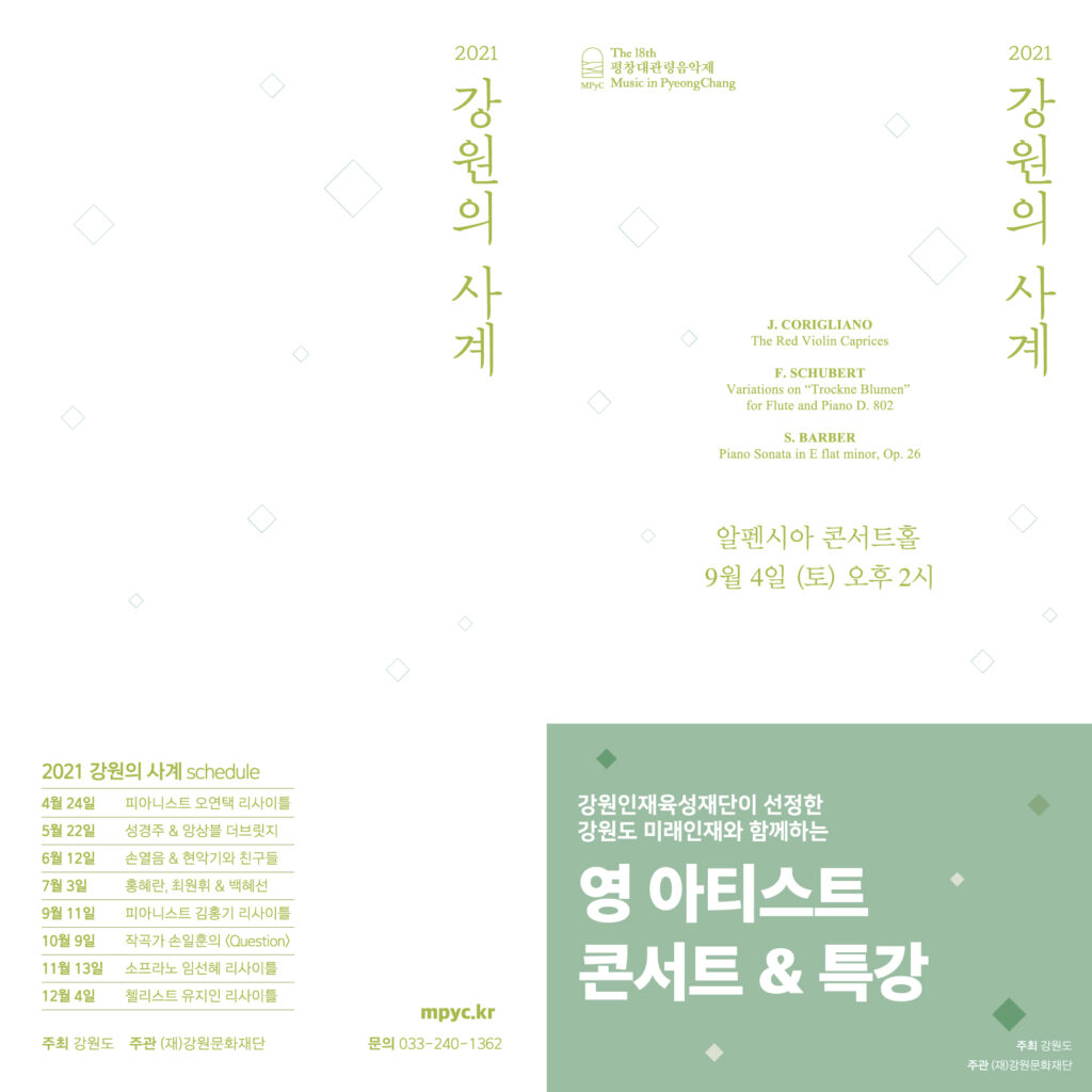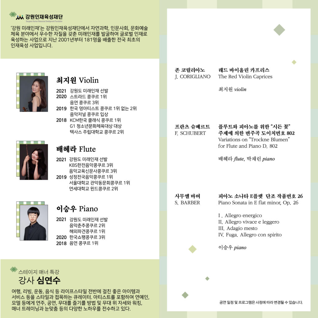 □ 강원도가 주최하고 강원문화재단(대표이사 김필국)이 주관하는 제18회 평창대관령음악제 「강원의 사계」(예술감독 손열음) 교육 프로그램 중 하나인 <영 아티스트 콘서트&특강>이 9월 4일 알펜시아 콘서트홀에서 「강원의 사계」 하반기 교육 프로그램의 첫 시작을 알린다.□ 강원인재육성재단과 함께하는 <영 아티스트 콘서트&특강>에서는 2021년 강원도 미래인재로 선발된 바이올린 최지원(서울대 1학년), 플루트 배혜라(이화여대 2학년), 피아노 이승우(서울대 2학년) 학생이 참여하여 약 120분간 콘서트와 특강을 진행할 예정이다.영 아티스트 콘서트는 스트라드 콩쿠르 1위, 음연 콩쿠르 3위 등에 입상한 바이올린 최지원(서울대 1학년) 양이 코릴리아노의 레드 바이올린 카프리스 연주로 무대를 열 예정이며, 두 번째로 성정전국음악콩쿠르 1등, KBS한전음악콩쿠르 3위 등의 입상 경력이 있는 플루트 배혜라(이화여대 2학년) 양이 슈베르트의 플루트와 피아노를 위한 “시든 꽃” 주제에 의한 변주곡을, 마지막으로 음연콩쿠르 1위, 한국쇼팽콩쿠르 3위, 음악춘추콩쿠르 2위에 입상한 피아노 이승우(서울대 2학년) 군이 바버의 피아노 소나타 E플랫 단조 작품번호 26을 연주하며 누구나 무료로 관람이 가능하다.콘서트 후에는 연주자로 참여한 학생을 대상으로 브랜드폴리시 심연수 이사의 스테이지 매너 특강이 비공개로 진행될 예정이며 영 아티스트 콘서트와 특강 모두 철저한 방역지침 준수와 방역 관리로 안전을 최우선으로 진행할 예정이다.□ 9월 14일(화)에는 <피아니스트 김홍기 찾아가는 마스터클래스> 도 예정하고 있으며 다양한 교육 프로그램을 통해 올 하반기에도 학교별 수요에 맞는 악기 군으로 수업을 구성하여 강원도 내 음악학교 학생들의 배움의 기회 확대와 실력 향상을 위해 힘쓸 예정이다.□ 한편, 하반기 「강원의 사계」 메인공연은 9월 11일 <김홍기 피아노 리사이틀>을 시작으로 10월 9일 <작곡가 손일훈의 Question>, 11월 13일 <소프라노 임선혜 리사이틀>, 12월 4일 <첼리스트 유지인 리사이틀>이 예정되어 있으며 티켓은 대관령음악제 홈페이지(mpyc.kr/tickets)와 인터파크 티켓 (ticket.interpark.com)에서 개별 또는 패키지로 구입할 수 있다.