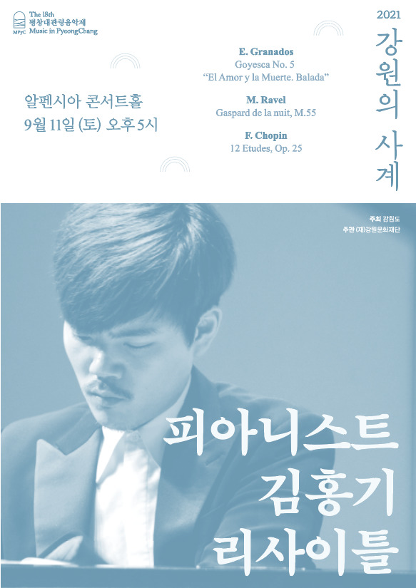 □ 강원도가 주최하고 강원문화재단(대표이사 김필국)이 주관하는 평창대관령음악제(예술감독 손열음)의 연중 프로그램 2021 <강원의 사계> 하반기 첫 번째 메인공연인 ‘피아니스트 김홍기 리사이틀’이 9월 11일 (토) 오후 5시에 평창 알펜시아 콘서트홀에서 열린다.□ 피아니스트 김홍기는 강원도 원주 출신으로 이번 공연에서 엔리케 그라나도스의 ‘고예스카스 중 제5곡 사랑과 죽음’, 모리스 라벨의 ‘밤의 가스파르’, 프레데리크 쇼팽의 ‘12개의 연습곡, 작품번호 25’를 연주한다. 이번 프로그램을 통하여 다채롭고 아름다운, 찬란하지만 씁쓸한 감정들을 풀어낼 피아니스트 김홍기는 기술적으로나 음악적으로나 모자람 없이 완벽한 음악이 아닌, 한 인간으로서 풀어내는 순수하고도 솔직한 이야기들이 관객분들께 닿기를 소망한다고 전했다.□ 또한 도내 음악학도들의 배움과 성장의 기회를 위해 피아니스트 김홍기의 찾아가는 마스터클래스를 9월 14일 (화) 오후 1시 강릉원주대학교에서 진행한다. 강릉원주대학교 피아노 전공생 3명을 대상으로 약 150분간 진행되며 청강은 강릉원주대학교 학생만 가능하다.전 세계를 무대로 활발한 음악 활동을 펼치고 있는 피아니스트 김홍기의 음악 세계와 노하우를 배울 수 있는 뜻깊은 시간이 될 것이다.□ 평창대관령음악제 운영실의 박혜영 운영실장은 2021 <강원의 사계>는 도민의 문화 향유 기회 확대를 위하여 연중 상시 공연으로 변화하여 지난 4월부터 매달 진행되고 있으며 콘서트 외에 도내 학생들의 역량 강화를 위해 ‘찾아가는 마스터클래스’와 ‘영 아티스트 콘서트’ 등 교육 프로그램도 함께 진행하고 있으며 하반기에는 ‘11시 콘서트’ 등을 기획하고 있다고 밝히며 코로나 상황이 안정적인 국면으로 접어들 때까지 앞으로도 안전관리에 지속적으로 만전을 기하면서 모든 일정을 순조롭게 운영할 예정이라고 하였다.□ <강원의 사계> ‘메인공연’ 티켓은 평창대관령음악제 공식홈페이지(mpyc.kr/tickets)와 인터파크 티켓(ticket.interpark.com)에서 구매할 수 있다. 티켓 가격은 2~3만원으로 강원도민 50%, 문화누리카드 소지자 50% 등 할인 혜택이 있다. 상반기에 이어 <하반기 공연 패키지 상품>도 함께 판매하고 있으며 패키지 상품 구매 고객에게는 음악제 기념품이 제공 될 예정이다.공연 및 티켓 관련 상세한 문의는 평창대관령음악제 운영실(033-240-1362)로 하면 된다.