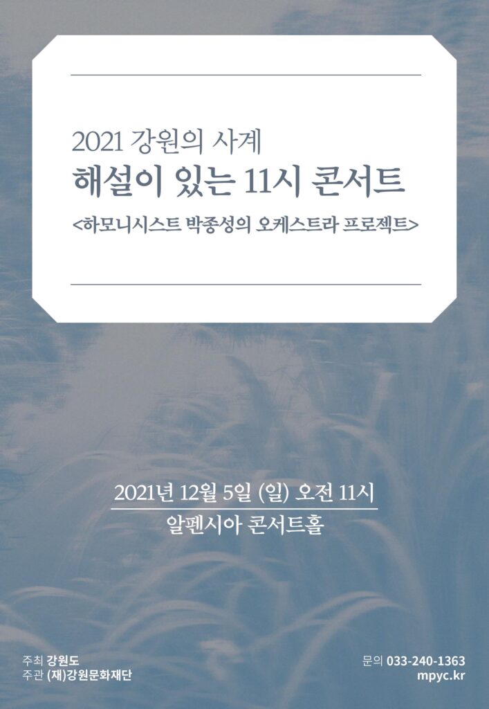 ▶ 11월 4일 (목) 오후 2시, 인터파크와 음악제 홈페이지에서 동시 티켓 오픈!!▶ 지역민들과 다양한 음악 함께 향유, 공연장의 문턱을 낮추고 클래식 음악 저변 확대2021 <강원의 사계>를 확대하여 선보이는 일요일 오전 콘서트 ‘해설이 있는 11시 콘서트’▶ 하모니시스트 박종성과 오케스트라가 함께 만드는 앙상블로 평창에서의 일요일 오전 특별한 시간!▶ 2021 <강원의 사계> 메인공연 12월 4일 (토) [첼리스트 유지인 리사이틀]과 묶어 할인 프로모션 진행