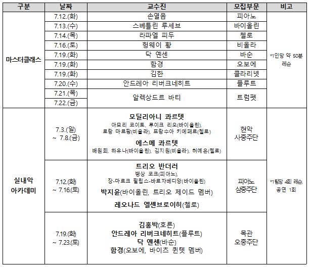 붙임 2. 제19회 평창대관령음악제 <2022 엠픽 아카데미> 마스터클래스, 실내악 아카데미 일정 및 모집부문 표