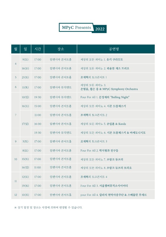 - 대관령음악제 연중기획시리즈 [MPyC Presents 2022] 연말까지 쭉 계속돼- 하반기 첫 시작으로 조재혁(Pf)과 그의 음악적 동료 김지연(Vn), 송영훈(Vc)이 꾸미는 관록의 무대 기대- 9월부터 12월까지 평창 알펜시아 콘서트홀에서 총 7회, 다채로운 공연 앞두고 있어