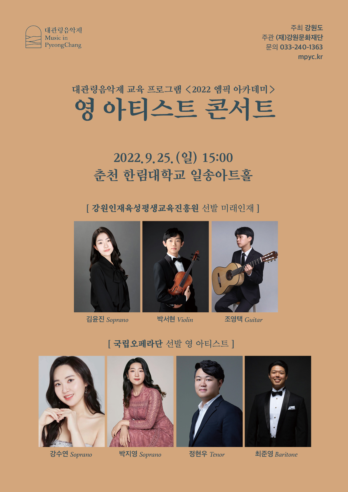 □ 대관령음악제 [2022 엠픽 아카데미] 연중 교육 프로그램의 일환인 <영 아티스트 콘서트>가 오는 9월 25일 일요일 오후 3시에 춘천 한림대학교 일송아트홀에서 열린다.□ 대관령음악제가 2019년부터 4년째 진행해 오고 있는 <영 아티스트 콘서트>는 도내 음악 인재를 발굴하고 육성하기 위한 교육 프로그램으로, 강원인재육성평생교육진흥원에서 선발된 문화예술 미래인재들에게 정상급 공연장에서의 연주 기회와 연주자로 성장하는데 중요한 부분인 무대 매너 교육 특강을 진행해왔다.특별히 올해는 강원인재육성평생교육진흥원에서 선발된 문화예술 미래인재들 뿐 아니라 국립오페라단에서 선발된 영 아티스트(신진 성악가)도 콘서트에 참여한다.강원문화재단은 지난 6월 국립오페라단과 공연예술 활성화와 교육프로그램 협력을 위한 업무협약을 맺은 바 있으며, 이번 <영 아티스트 콘서트>가 그 첫 협력 프로젝트이다.□ 이번 <영 아티스트 콘서트> 무대에 서는 3명의 강원인재육성평생교육진흥원 선발 미래인재는 한음음악콩쿨 1위, 음악교육신문사 콩쿠르 3위에 입상한 소프라노 김윤진(서울예고 1학년)과 금호문화재단 영 아티스트 선발, 전국기타콩쿨 마스터 부문 우승자 기타리스트 조영택(서울대 2학년), 그리고 동아주니어음악콩쿠르 2위, 메뉴힌 국제콩쿠르 본선 진출자인 바이올리니스트 박서현(홈스쿨링)이며 슈베르트의 가곡 들장미, 바흐의 파르티타 2번 D단조 작품번호 1004 중 샤콘느 등을 연주한다.이번 대관령음악제 <영 아티스트 콘서트> 무대에 처음으로 오르는 국립오페라단에서 선발한 4명의 신진 성악가는 2021 국립오페라단 성악콩쿠르 금상을 수상한 테너 정현우를 비롯, 2021년과 2022년 국립오페라 스튜디오(KNO Studio:대한민국을 대표할 오페라 인재를 양성하는 특별 프로젝트) 단원으로 활동한 바리톤 최준영, 소프라노 강수연, 소프라노 박지영이다.이들은 구노의 오페라 「파우스트」 중 “정결한 집(Salut! demeure chaste et pure)”, 마스네의 오페라 「마농」 중 “내가 거리에 나서면(Je marche sur tous les chemins)”, 로시니의 오페라 「세빌리아의 이발사」 중 “나는 이 거리 제일의 만물박사(Largo al factotum della città)” 등 대표적인 오페라 아리아와 이원주의 <베틀노래>, 이수인의 <내 맘의 강물> 등 아름다운 한국 가곡들을 노래한다.□ 이번 <영 아티스트 콘서트>(9월 25일 일요일 오후 3시 춘천 한림대학교 일송아트홀)는 전석 무료로 사전예매 없이 관람 가능하며, 자세한 사항은 대관령음악제 홈페이지(mpyc.kr) 또는 대관령음악제 운영실(033-240-1363)로 문의하면 된다.□ 대관령음악제는 [2022 엠픽 아카데미] 연중 교육 프로그램 <영 아티스트 콘서트>를 통해 도내 음악 미래인재들에게 세계적인 연주자로 성장할 수 있는 발판을 마련하고 있으며, 올해는 그 역량을 더욱 발휘할 수 있는 기회를 제공하기 위해 협연 프로그램인 <영 아티스트 협주곡 콘서트>를 추가로 마련하였다.<영 아티스트 협주곡 콘서트>는 오는 11월 2일(수) 정민 상임지휘자가 이끄는 강릉시립교향악단과 강원인재육성평생교육진흥원 선발 미래인재들의 협연으로 강릉아트센터 사임당홀에서 열릴 예정이다.□ 한편, 대관령음악제운영실에서는 [2022 엠픽 아카데미] ‘연중 교육 프로그램’을 4월부터 진행해오고 있으며, 하반기에도 강원도 음악 전공 학생들에게 양질의 교육 기회를 제공하기 위해 <찾아가는 마스터클래스>, <직업 진로 특강> 또한 지속하여 진행할 예정이다.| ■ 이 보도자료와 관련하여 자세한 내용이나 취재를 원하시면 평창대관령음악제 운영실(☎033-240-1368/(academy@mpyc.kr) 로 연락 바랍니다.■ 음악제 웹하드 : www.webhard.co.kr (게스트) ID : mpycgw PW : mpyc GUEST 폴더 > 영 아티스트 콘서트 |
