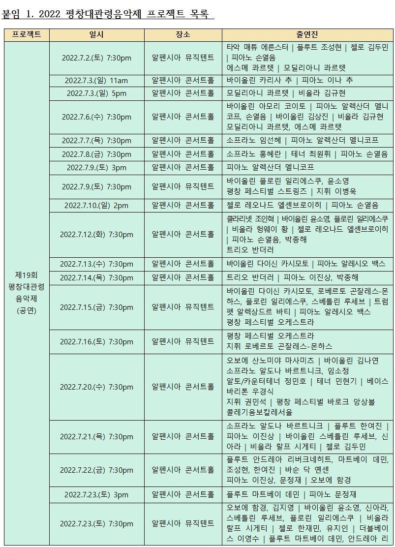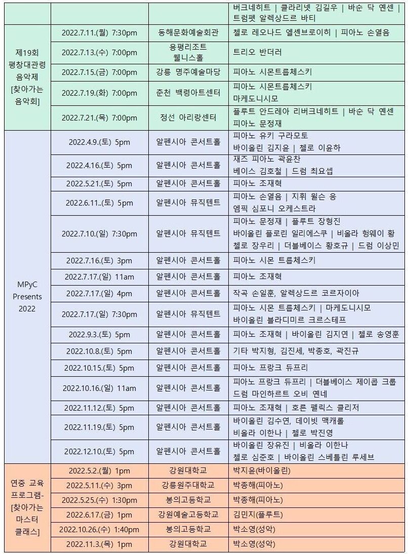 - 대관령음악제 19년의 전통과 역량으로 2022년 전(全) 프로젝트 성황리에 마무리!!!- 역대 최장기간인 3주간 독창적인 프로그래밍과 새로운 시도로 최다 관객을 동원한 ‘제19회 평창대관령음악제’- 도민에게 수준 높은 문화예술 컨텐츠를 지속 제공, 공연예술향유 확대에 기여한 연중기획시리즈 ‘MPyC Presents 2022’- 시즌과 연중으로 구분하여 강원도를 비롯한 모든 음악학도를 위한 차별화된 교육 프로그램을 제공한 ‘대관령 아카데미’- 특색있는 다양한 장르의 ‘4色 콘서트’ 진행으로 도내 공연예술 관객 저변 확대 및 지역민과 음악으로 소통하고 공감하며 지역문화 격차 해소에 기여- 2024 동계유스올림픽 개막 D-2주년 기념한 강원도 대표 겨울 축제로 기억된 ‘2022 대관령겨울음악제’