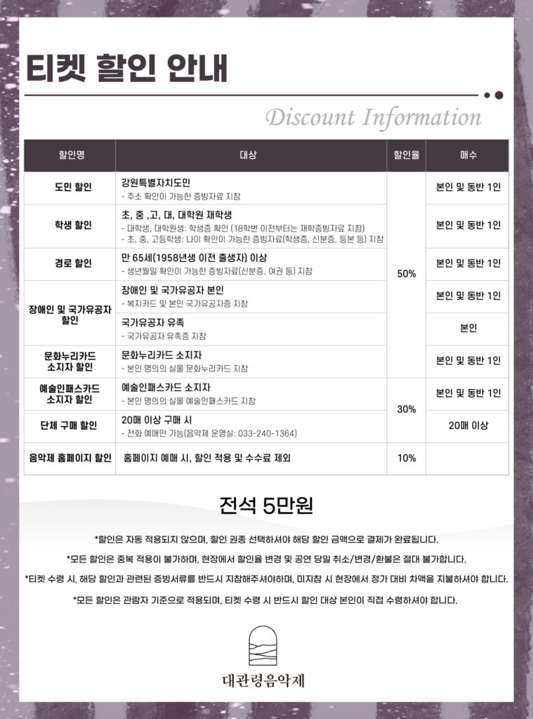 (ex. 음악제 홈페이지 예약 – 강원도민 할인 = 예매 수수료없이 50% 할인 적용)