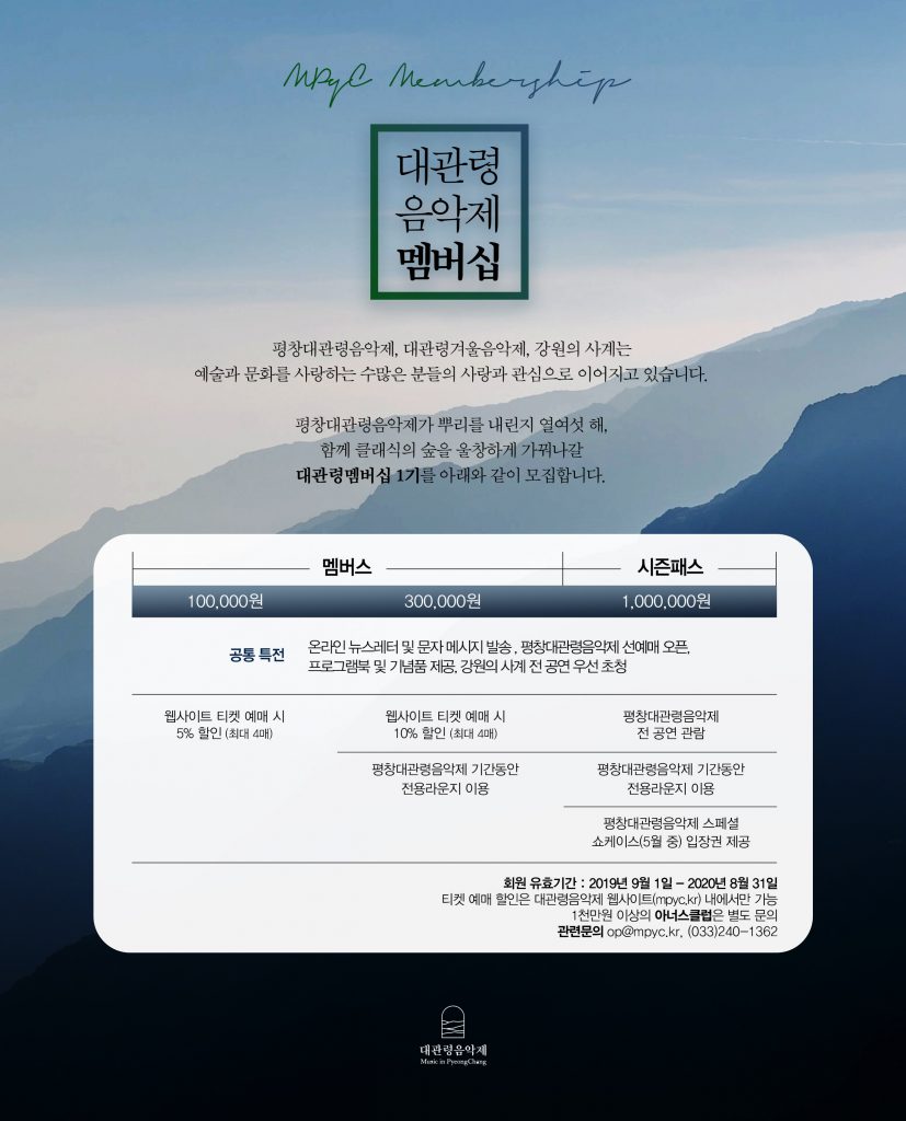 News Notice 대관령음악제 멤버십 1기 모집 Date : 2019.08.06 View : 381 Prev 8월 3일 16시 '못다 한 이야기' 엠픽라이브 취소 Next 2020 대관령겨울음악제 티켓 오픈 D-7 List