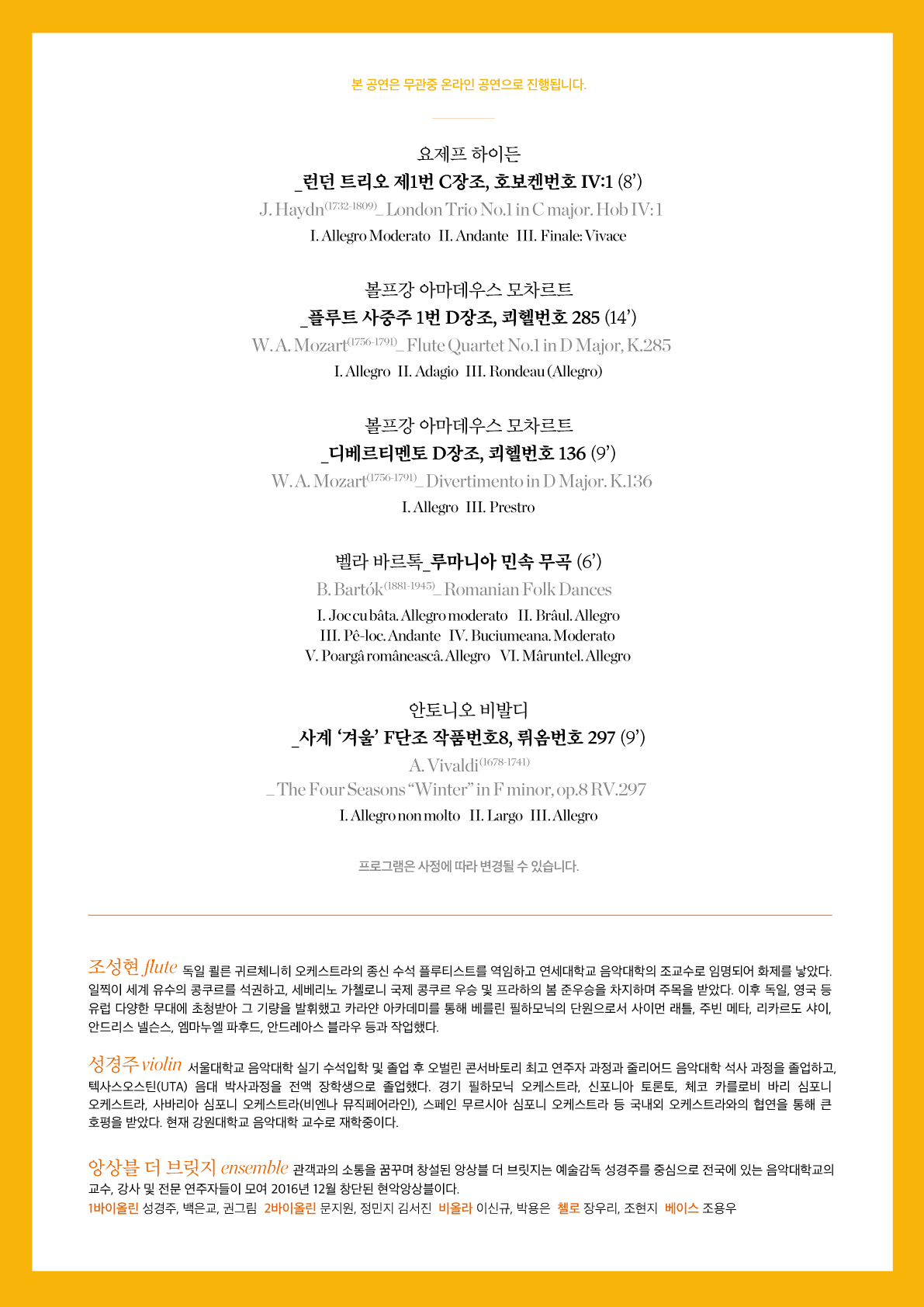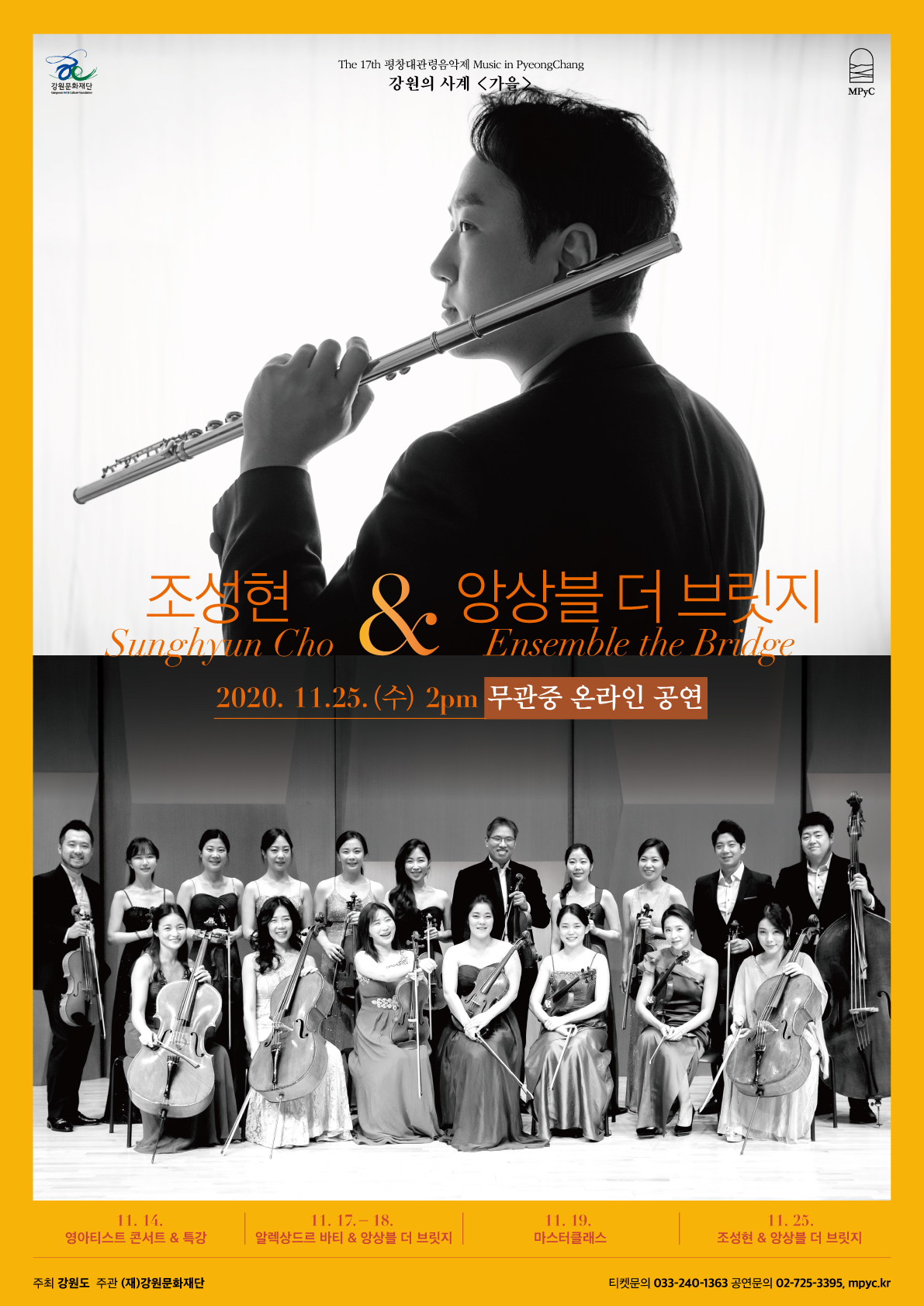♦ 조성현 & 앙상블 더 브릿지 콘서트 온라인 생중계 – 공연일시 : 11월 25일(수) 오후 2시– 유튜브 ‘대관령음악제’↓ 바로가기 ↓https://www.youtube.com/c/MPYCTV