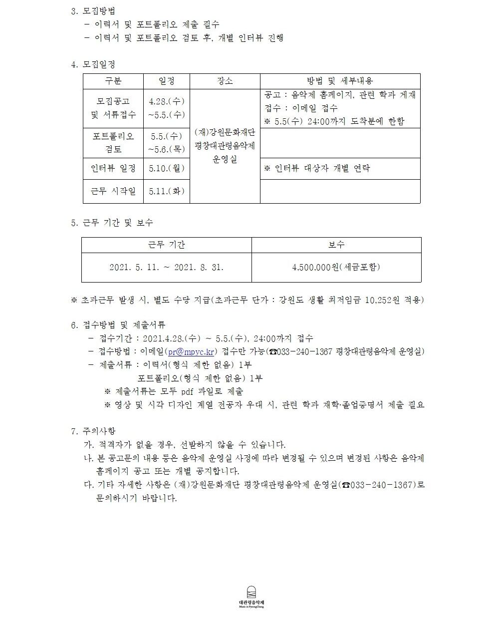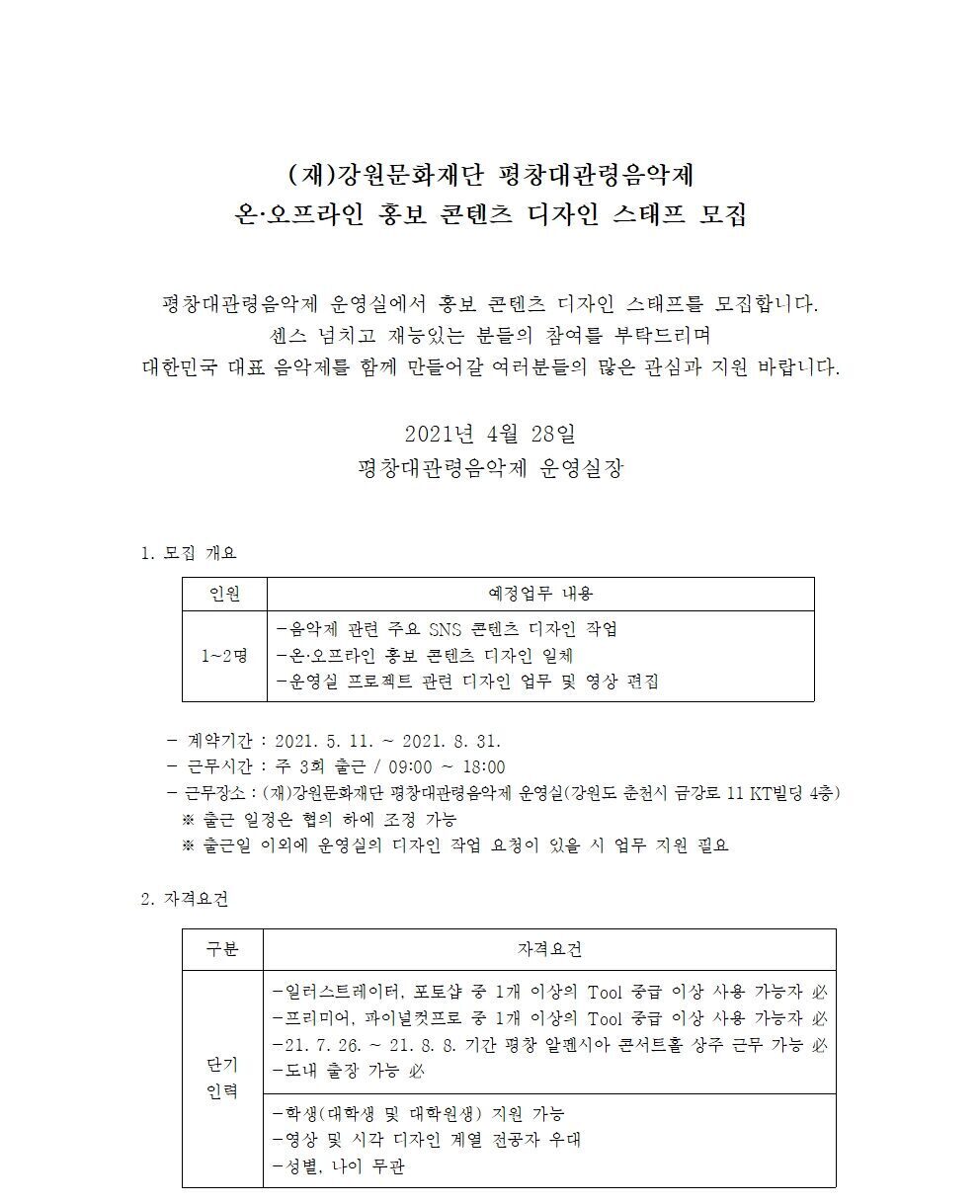 News Notice [공고] 온·오프라인 홍보 콘텐츠 디자인 스태프 모집(4.28.~5.5.) Date : 2021.04.28 View : 469 평창대관령음악제_디자인 스태프 모집 공고(210428) Prev [2021 강원의 사계] 메인공연 예매 바로가기 Next [제18회 평창대관령음악제] 메인 포스터 공개 List
