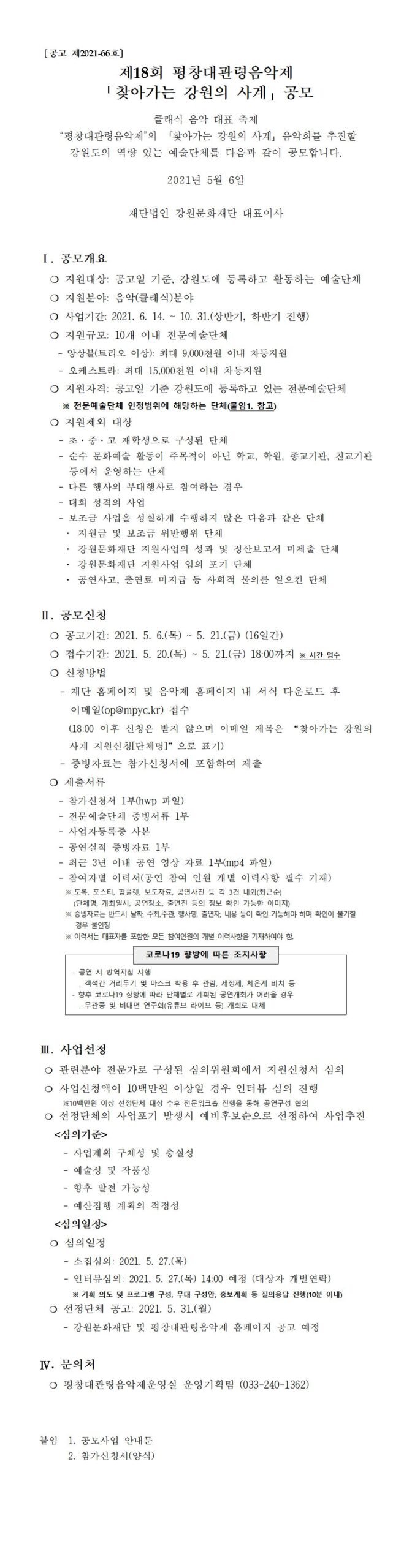 News Notice [공모] 제18회 평창대관령음악제 ⌜찾아가는 강원의 사계⌟ Date : 2021.05.06 View : 485 찾아가는 강원의 사계 붙임_안내문, 신청서 Prev [제18회 평창대관령음악제] 메인 포스터 공개 Next [제18회 평창대관령음악제] 메인 & 스페셜 콘서트 프로그램 공개 List