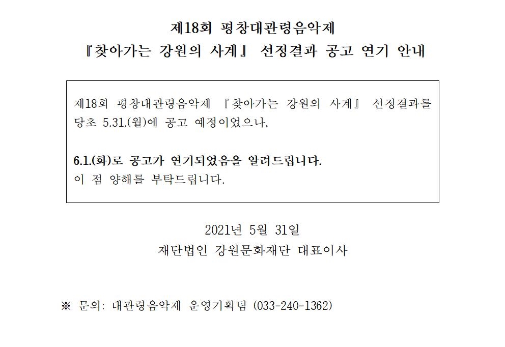News Notice [제18회 평창대관령음악제] 『찾아가는 강원의 사계』 선정결과 공고 연기 안내 Date : 2021.06.01 View : 439 Prev [제18회 평창대관령음악제] 시즌패스(총 15회_메인 13회+스페셜 2회) *선착순 판매 Next [공고] 제18회 평창대관령음악제 『찾아가는 강원의 사계』 선정결과 안내 List