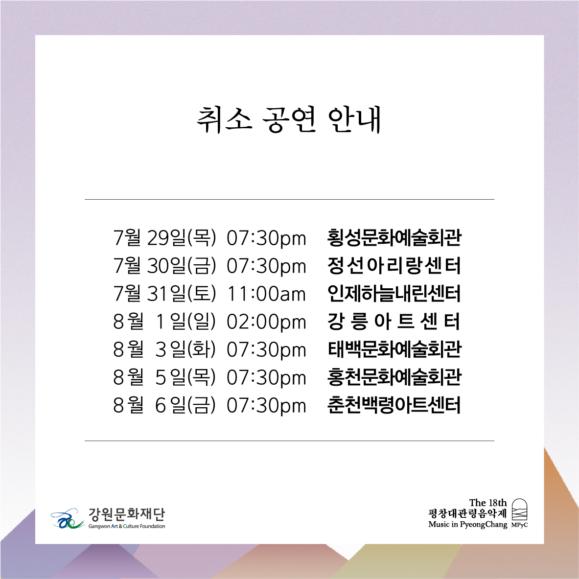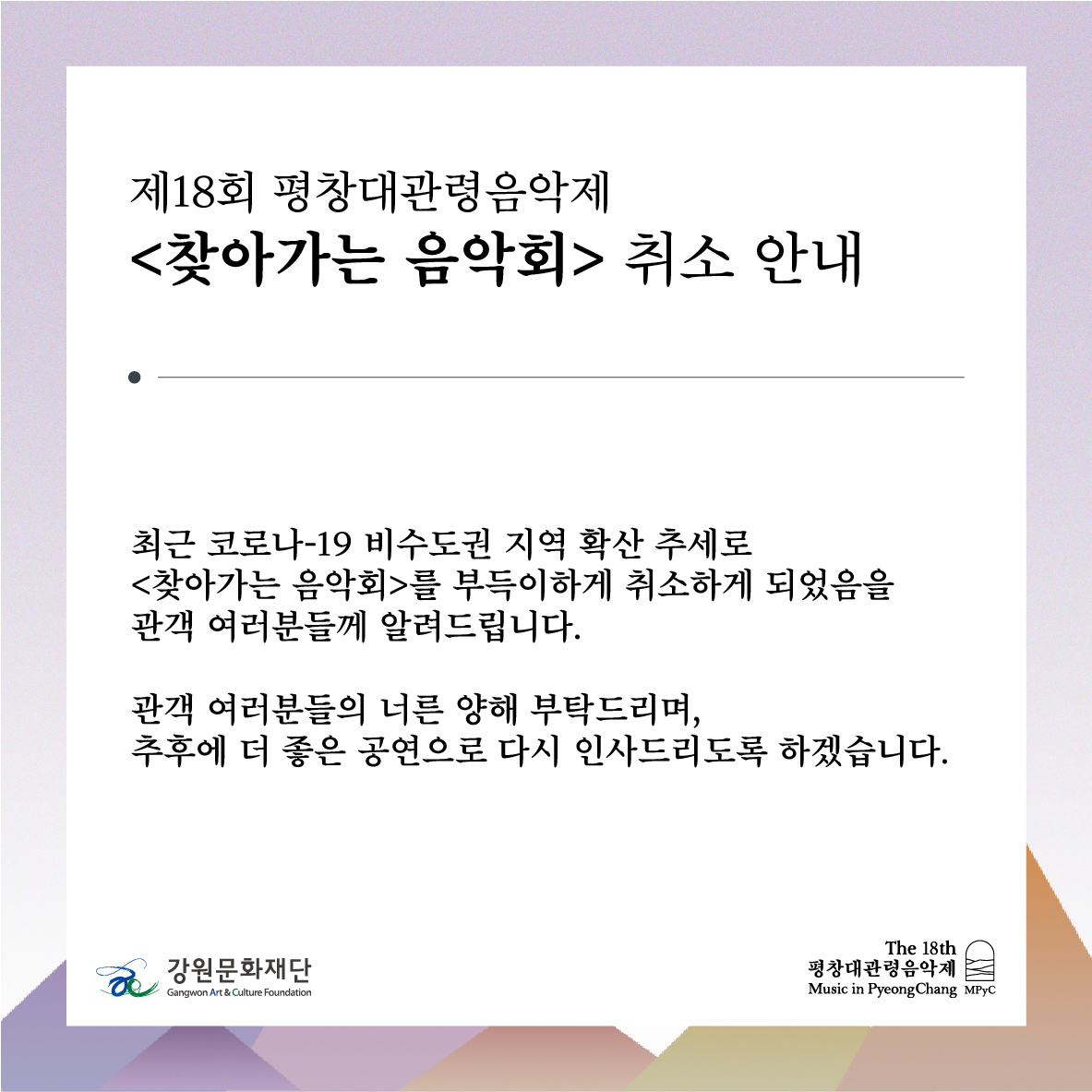 News Notice [제18회 평창대관령음악제] 찾아가는 음악회 취소 안내 Date : 2021.07.27 View : 426 Prev [제18회 평창대관령음악제] 찾아가는 강원의 사계 공연 안내 Next [제18회 평창대관령음악제] 로컬 파트너사 티켓 프로모션 안내 List