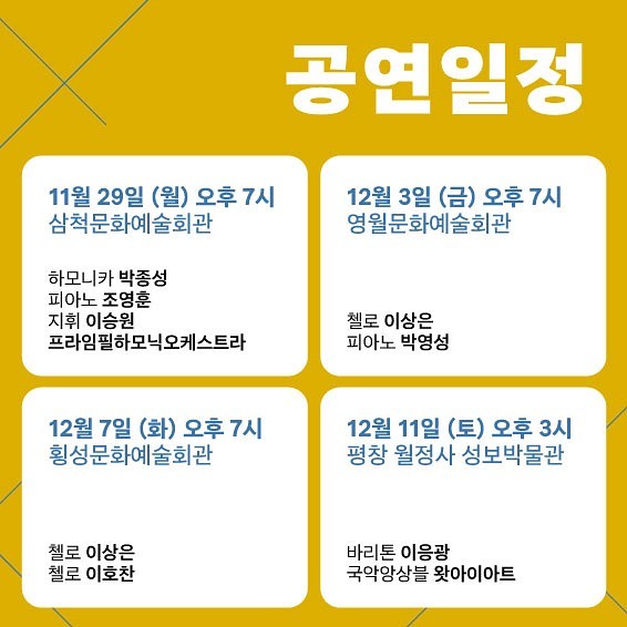 ? 다시! 찾아가는 음악회 - 하모니시스트 박종성의 오케스트라 프로젝트• 일시 : 2021. 11. 29. (월) 오후 7시• 장소 : 삼척문화예술회관• 출연진 : 하모니카_박종성 | 피아노_조영훈 | 지휘_이승원 | 프라임필하모닉오케스트라