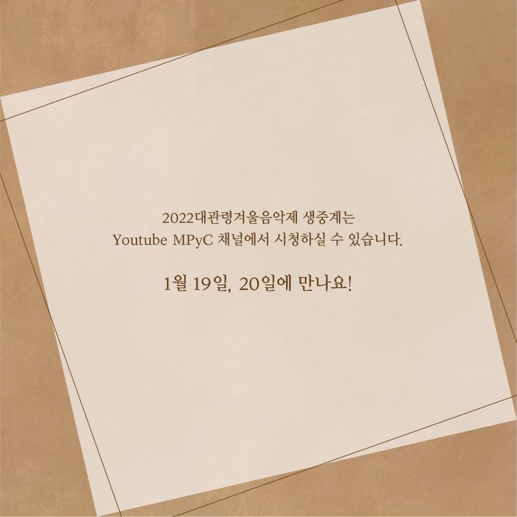 News Notice [2022 대관령겨울음악제] 유튜브(Youtube) 생중계 공연 안내 Date : 2022.01.14 View : 3854 2022 대관령겨울음악제를 즐기는 또 하나의 방법바로, 유튜브 생중계 인데요.1월 19일과 1월 20일 평창 알펜시아 콘서트홀에서 열리는이 두 공연은 유튜브 'MPyC TV'를 통하여 생중계 된답니다. ??어디서든 대관령음악제와 함께 해요!?? Prev [2022 대관령겨울음악제] 방역패스 의무적용에 따른 공연장 이용안내 Next [2022 대관령겨울음악제] 22년 1월 18일(화)부터 공연장 방역패스 해제 안내 List