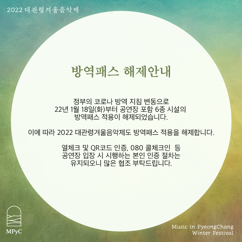News Notice [2022 대관령겨울음악제] 22년 1월 18일(화)부터 공연장 방역패스 해제 안내 Date : 2022.01.18 View : 484 정부의 코로나 방역 지침 변동으로22년 1월 18일(화)부터 공연장을 포함한 6종 시설의 방역패스 적용이 해제되었습니다.이에 따라, 2022 대관령겨울음악제 역시 방역패스 적용을 해제합니다. 열체크 및 QR코드 인증, 080 콜체크인 등 공연장 입장 시 행하는 본인 인증 절차는 유지되오니많은 협조 부탁드립니다.더 자세한 정보는 보건복지부의 보도자료에서 확인하실 수 있습니다.보건복지부 보도자료 링크 바로가기 Prev [2022 대관령겨울음악제] 유튜브(Youtube) 생중계 공연 안내 Next [공고] 평창대관령음악제운영실 직원 공개모집(일반직 7급, 기간제 근로자) List