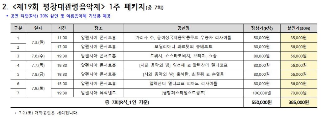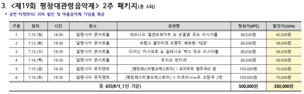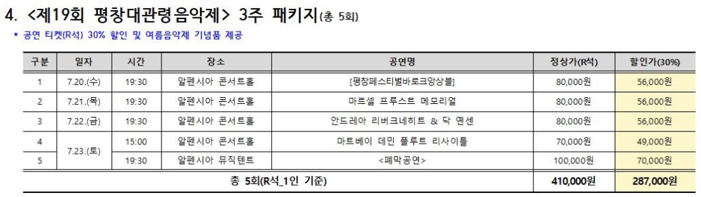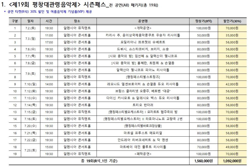 ▸ 티켓가격1) 시즌패스_전 공연(All) 패키지(총 19회) R석 30% 할인가 ⇒ 1,092,000원(1인 기준)2) 1주 패키지(총 7회) R석 30% 할인가 ⇒ 385,000원(1인 기준)3) 2주 패키지(총 6회) R석 30% 할인가 ⇒ 350,000원(1인 기준)4) 3주 패키지(총 5회) R석 30% 할인가 ⇒ 287,000원(1인 기준)