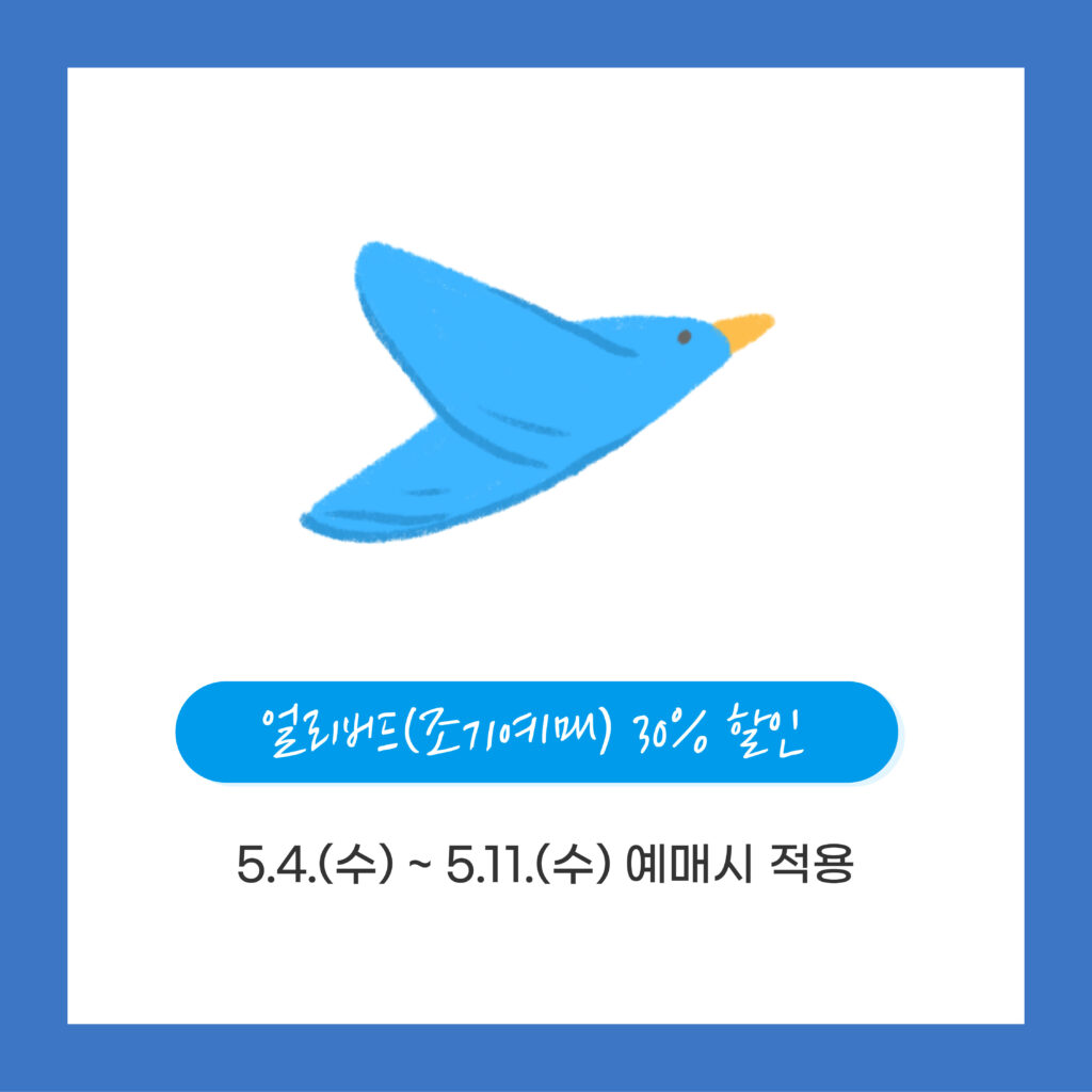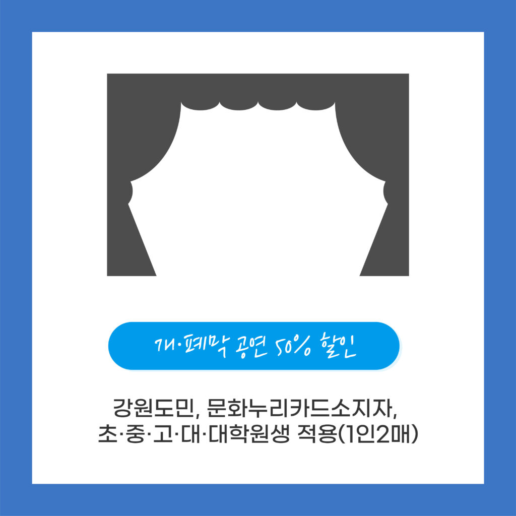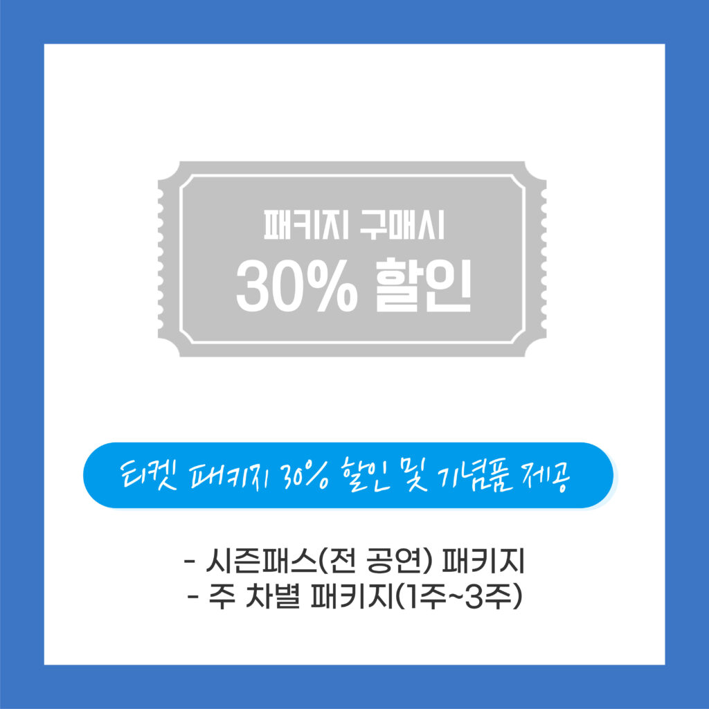 ???????✔얼리버드(조기예매) 30% 할인- 5.4.(수) ~ 5.11.(수) 예매시 적용✔티켓 패키지 30% 할인 및 기념품 제공- 시즌패스(전 공연) 패키지- 주 차별 패키지(1주~3주)✔개·폐막 공연 50% 할인- 강원도민, 문화누리카드소지자, 초·중·고·대·대학원생 적용(1인 2매)