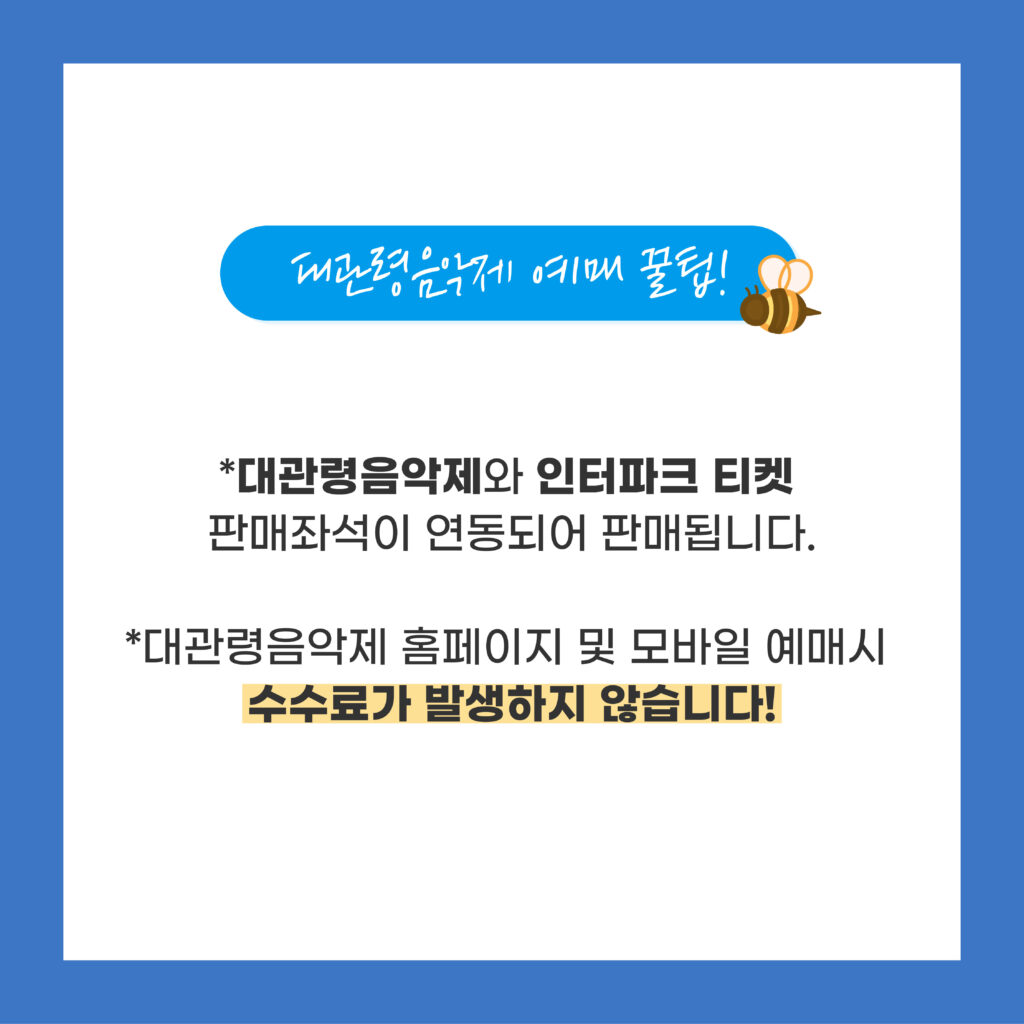 Tip- 대관령음악제와 인터파크 티켓 판매좌석이 연동되어 판매되며대관령음악제 홈페이지 및 모바일 예매시 수수료가 발생하지 않습니다!