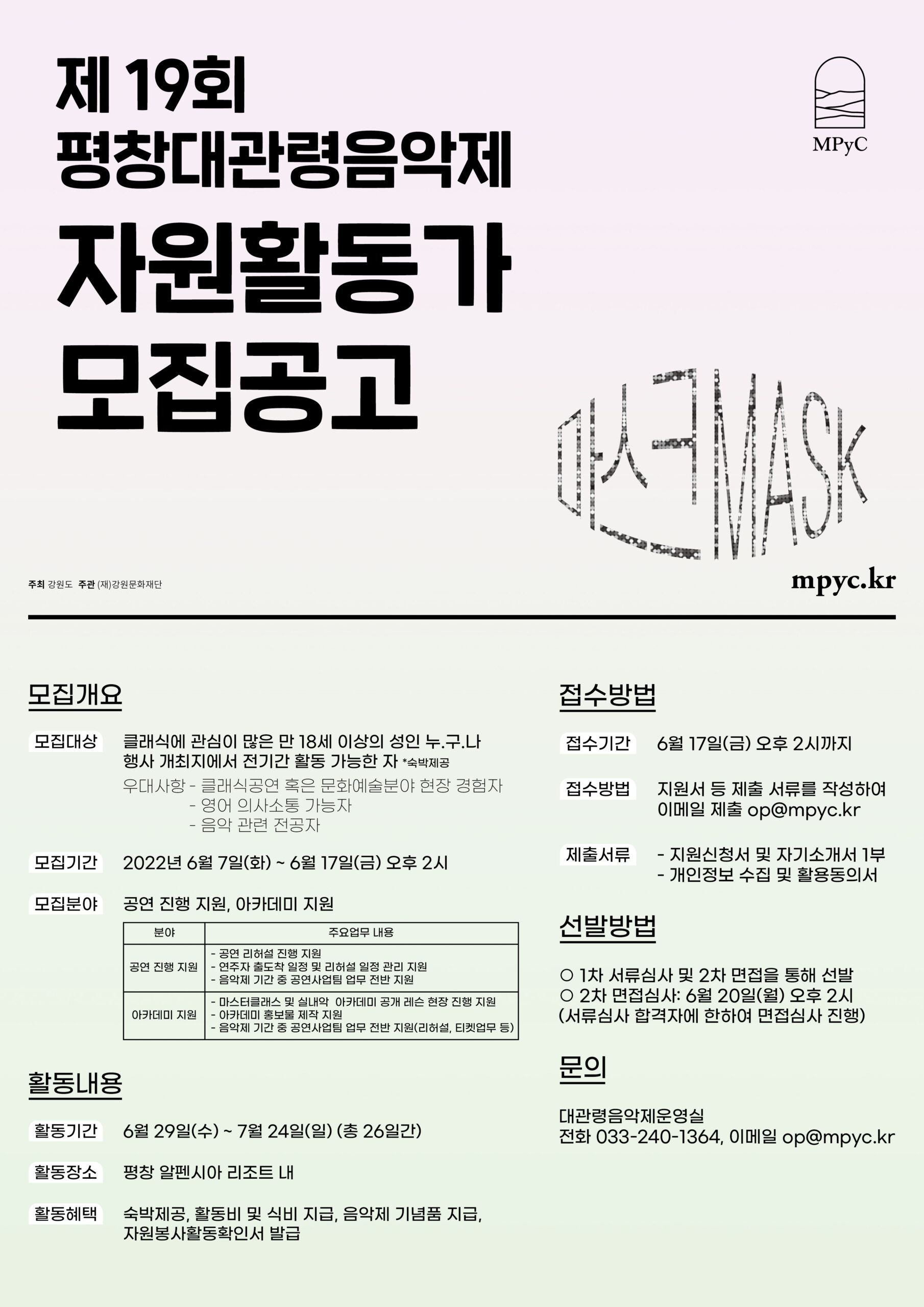 News Notice [공고] 제19회 평창대관령음악제 자원활동가 모집공고(~ 6.17.(금) 오후 2시) Date : 2022.06.03 View : 499 ↓제19회 평창대관령음악제 자원활동가 지원서 Prev [제19회 평창대관령음악제] 2022 엠픽 아카데미(MPyC Academy) 접수 바로가기 Next [제19회 평창대관령음악제] 무료 셔틀버스 운행 안내 List