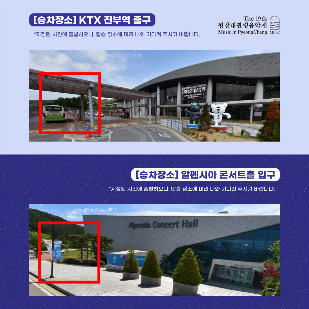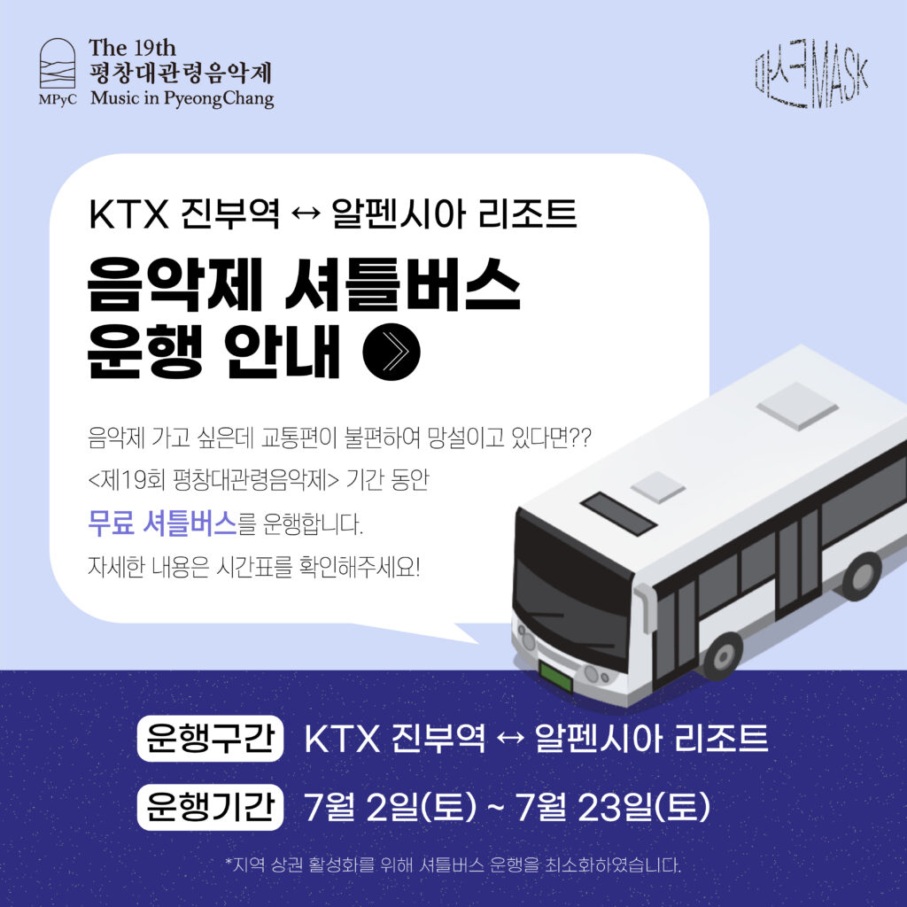 ‘제19회 평창대관령음악제’ 개최 기간(7.2.~7.23.)동안KTX 진부역에서 알펜시아 공연장 간 무료 셔틀버스를 운행합니다.