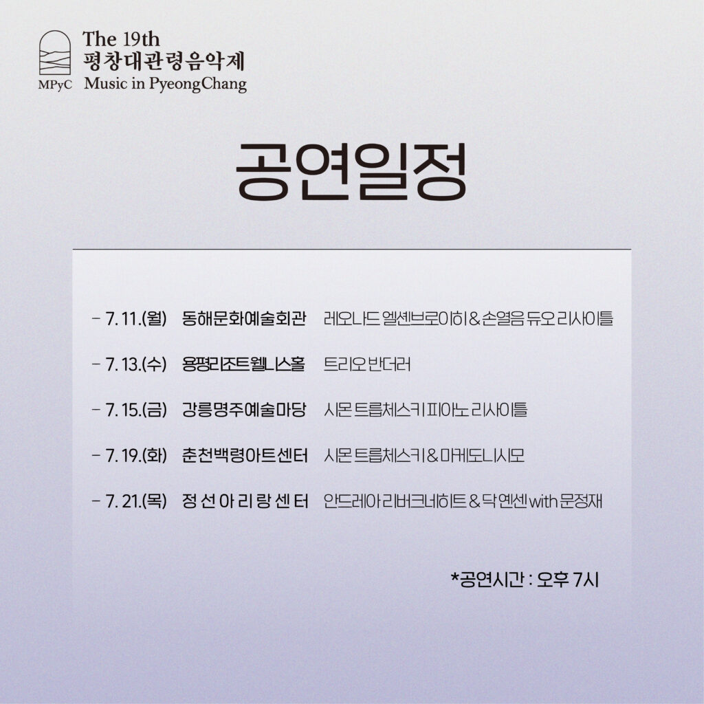 ?7.11.(월) 동해문화예술회관-레오나드 엘셴브로이히 & 손열음 듀오 리사이틀?7.13.(수) 용평리조트 웰니스홀-트리오 반더러?7.15.(금) 강릉명주예술마당-시몬 트릅체스키 피아노 리사이틀?7.19.(화) 춘천백령아트센터-시몬 트릅체스키 & 마케도니시모?7.21.(목) 정선아리랑센터-안드레아 리버크네히트 & 닥 옌센 with 문정재