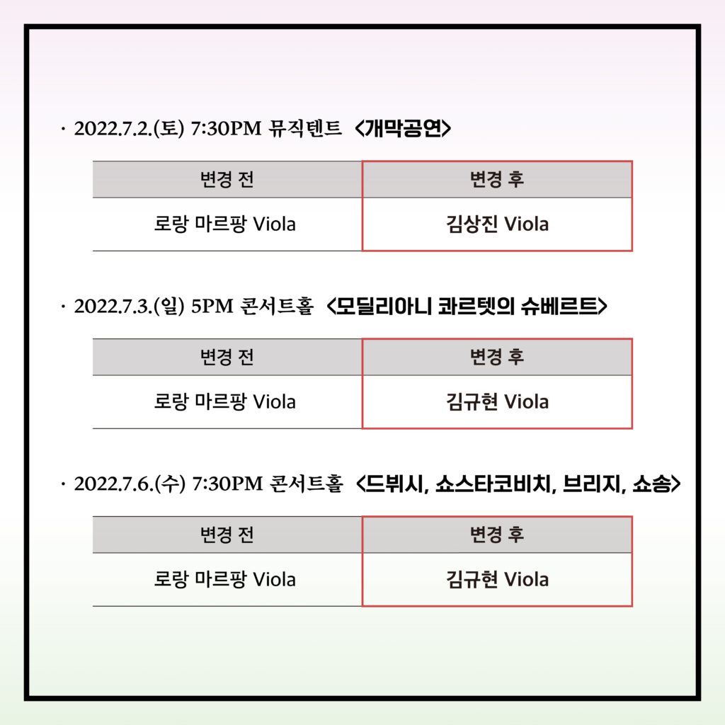 · 2022.7.3.(일) 5PM 콘서트홀 <모딜리아니 콰르텟의 슈베르트>로랑 마르팡 Viola → 김규현 Viola