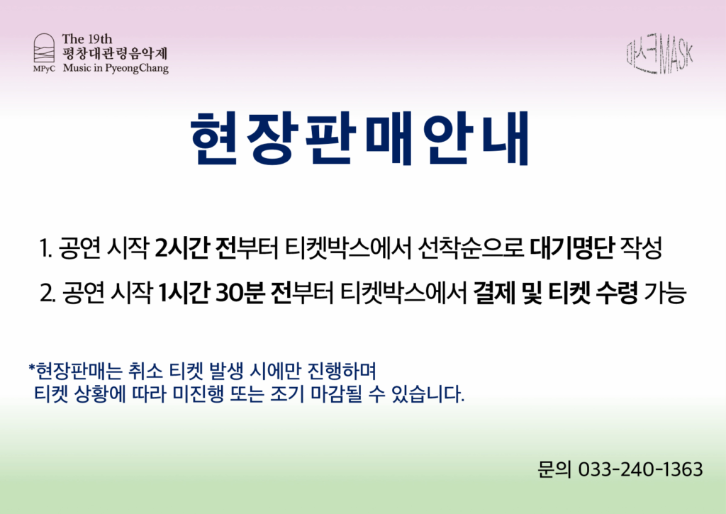 News Notice [제19회 평창대관령음악제] 예매티켓(음악제, 인터파크) & 현장판매 안내 Date : 2022.07.02 View : 516 Prev [제19회 평창대관령음악제] 관람객 프로모션 안내 Next [제19회 평창대관령음악제] 7월 6일 공연 연주자 및 프로그램 변경 안내 List