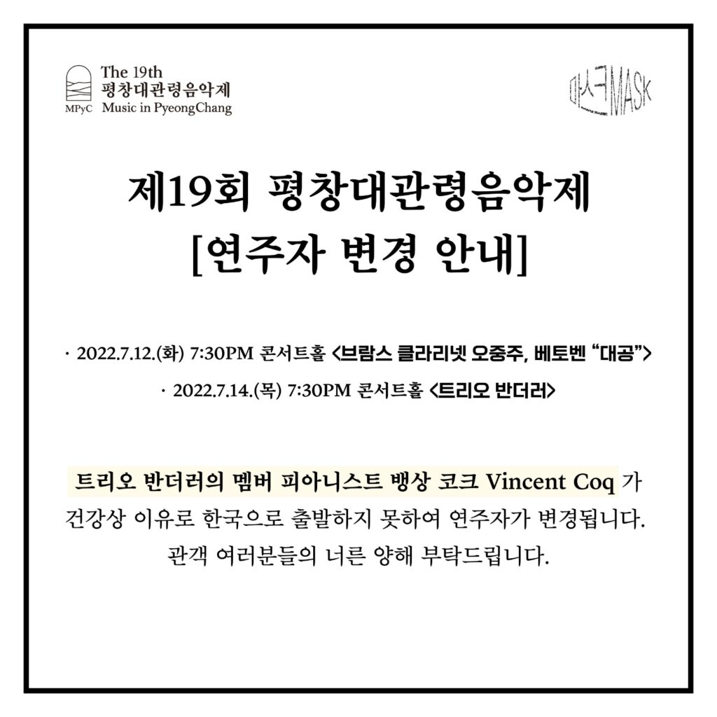 [제19회 평창대관령음악제] 7월 12일 & 14일 공연 연주자 변경 안내