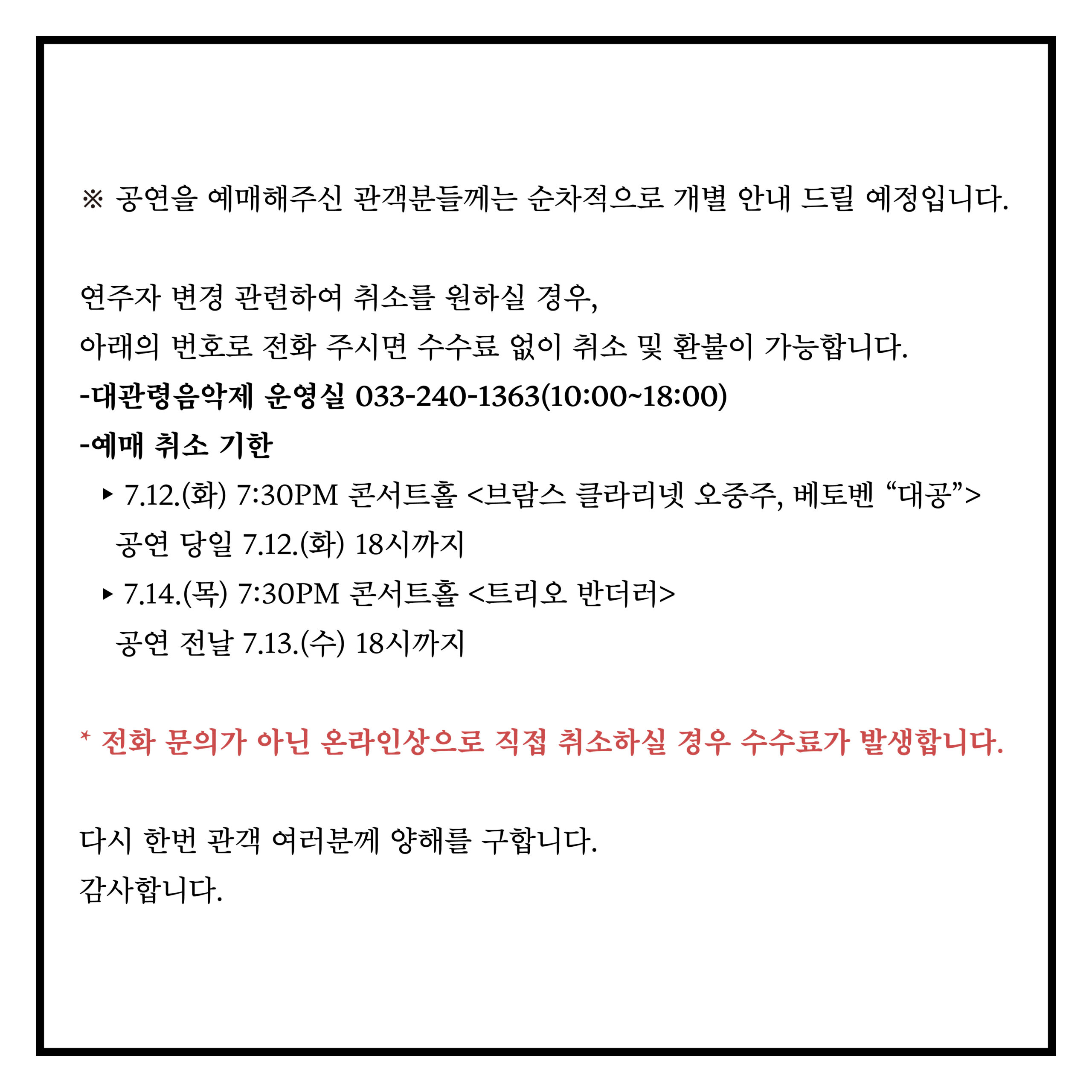연주자 변경 관련하여 취소를 원하실 경우대관령음악제 운영실 033-240-1363(10:00~20:00)를 통해 수수료 없이 취소 및 환불이 가능합니다.