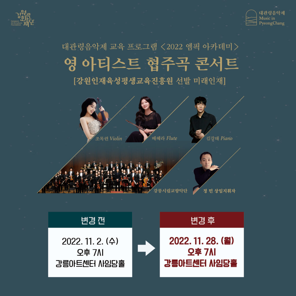 • 공 연 일 : 2022. 11. 28.(월) 오후 7시• 장 소 : 강릉아트센터 사임당홀• 관람방법 : 전석무료 & 사전예약(1인 4매까지)• 출 연 진 : 조목련_바이올린, 배혜라_플룻, 김강태_피아노, 강릉시립교향악단(정민 상임 지휘자)- 공연 예매는 비지정석이며,공연 시작 1시간 전부터 티켓박스에서 선착순으로 좌석이 배정됩니다.(*공연시작 20분 전까지 미수령 티켓은 좌동 취소되며 현장대기자에게 배부됩니다.)• 관람연령 : 8세 이상 관람 가능• 예 매 처 : 음악제 홈페이지 & 강릉아트센터 홈페이지