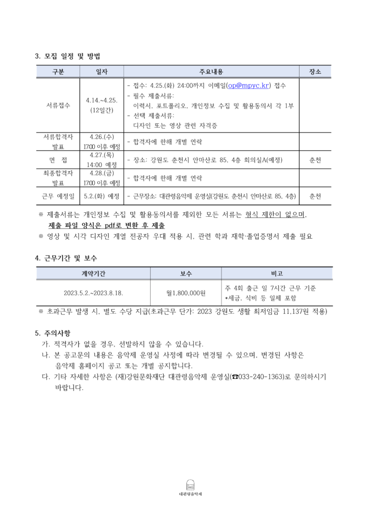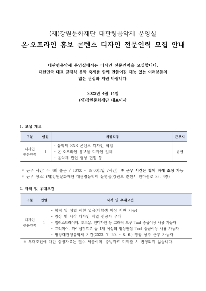 News Notice [공고] 대관령음악제 운영실 온·오프라인 홍보 콘텐츠 디자인 단기 전문인력 모집 Date : 2023.04.14 View : 456 붙임1. 2023년도 대관령음악제 디자인 인력 채용공고붙임2. 개인정보 수집 및 활용동의서 Prev [제20회 평창대관령음악제] 5월 3일 14:00 티켓 오픈! Next [재공고] 대관령음악제 운영실 온·오프라인 홍보 콘텐츠 디자인 단기 전문인력 모집 List