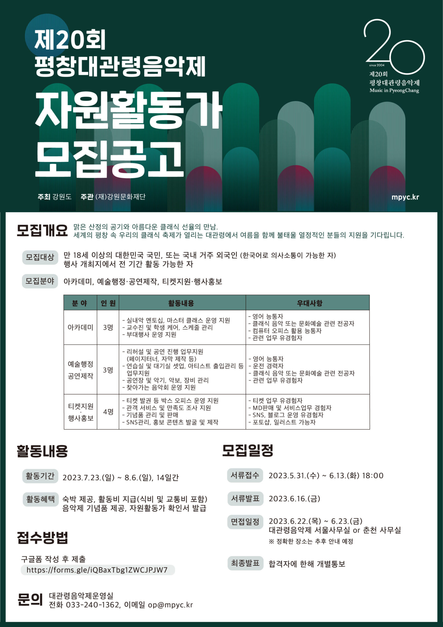 News Notice [공고] 제20회 평창대관령음악제 자원활동가 모집 Date : 2023.05.30 View : 481 >>지원서 작성 바로가기<< Prev [공고] 평창대관령음악제운영실 채용공고(일반직 7급, 기간제 근로자) Next [The 20th MPyC] 2023 MPyC Academy 'Chamber Mentorship Program' recruitment of participants List