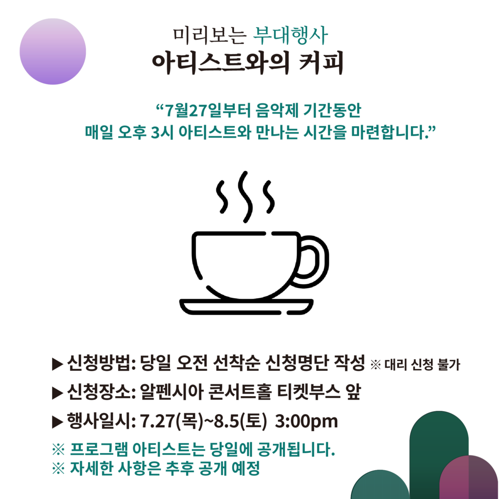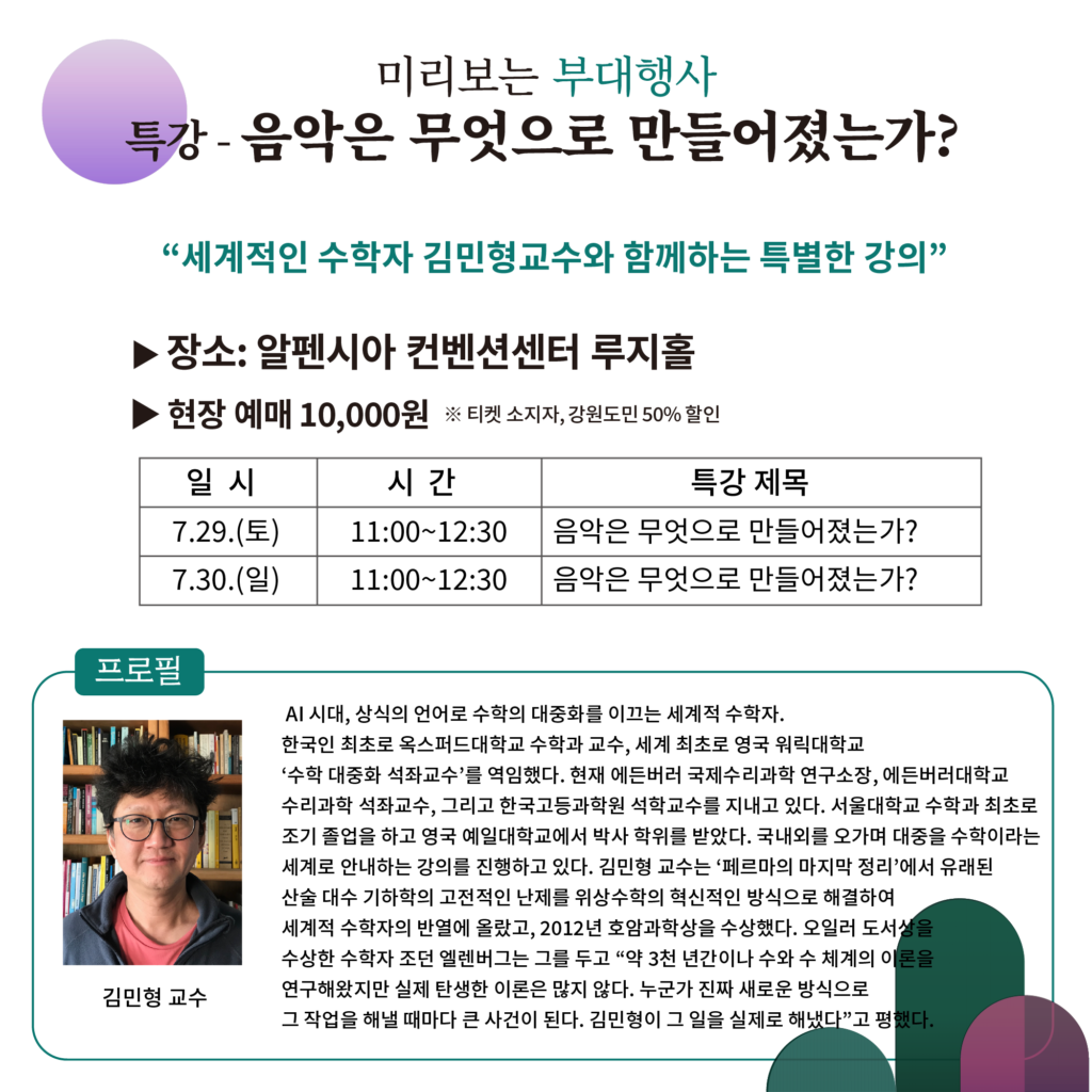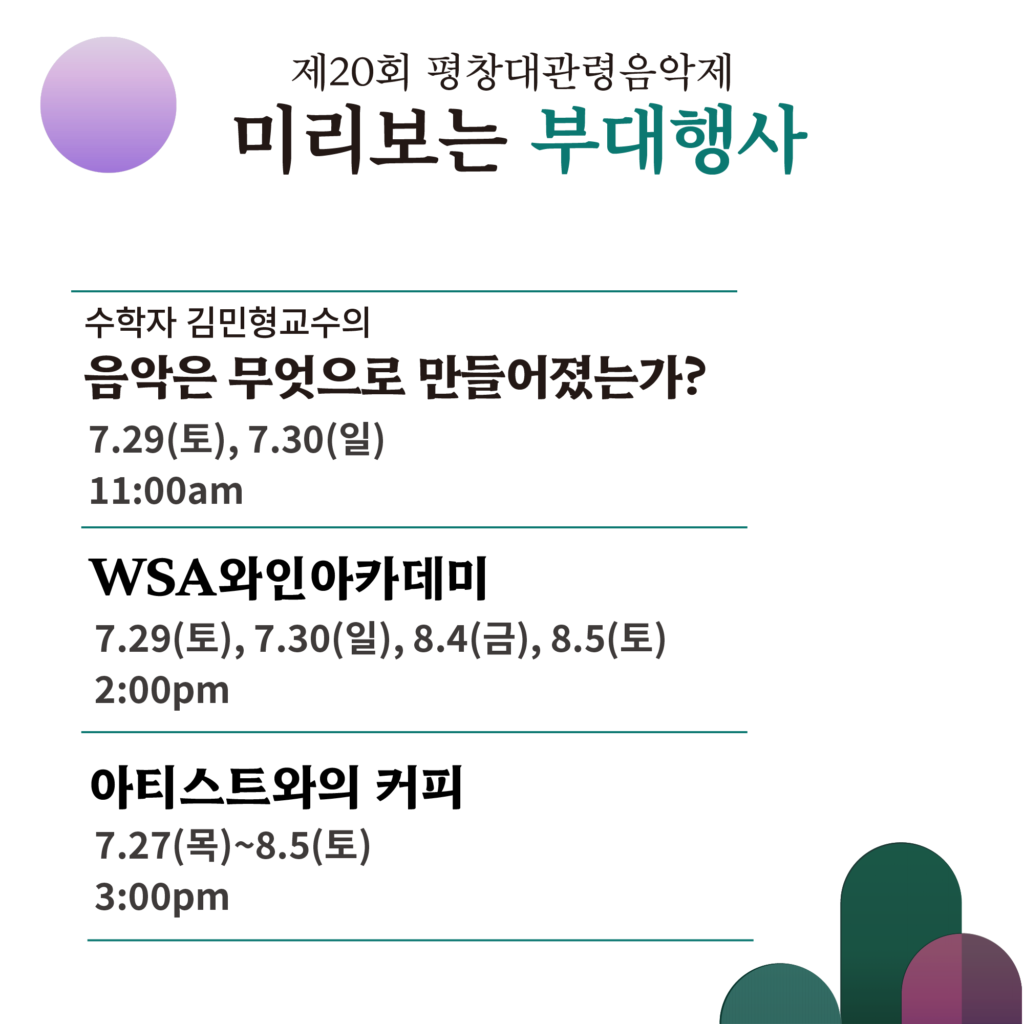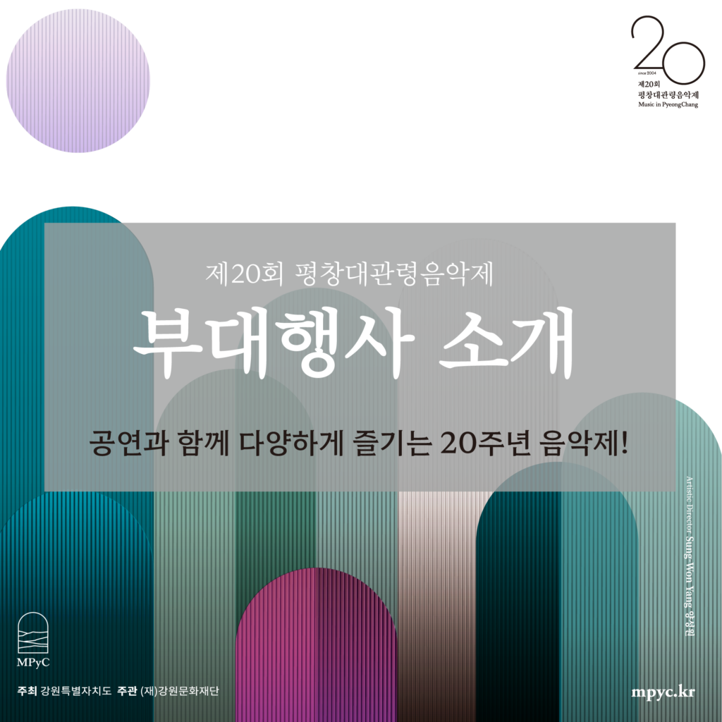 News Notice [제20회 평창대관령음악제] 부대행사 소개? Date : 2023.07.13 View : 484 제 20회 평창대관령음악제 '부대행사' 소개?많은 분들이 기다리셨던, 20주년을 맞아 새롭게 선보이는 <부대행사>를 소개합니다!공연과 함께 다양하게 즐기는 제20회 평창대관령음악제!❤️수학자 김민형교수와 함께하는 특강부터 아티스트와 함께하는 커피까지!자세한 내용은 하단 이미지 참고부탁드립니다. Prev [제20회 평창대관령음악제] 7월 28,29,30일 연주자 및 프로그램 변경 공지 Next [강원의 사계] 강원의 사계<가을>'양성원&엔리코 파체' 9월 13일 2:00pm 티켓 오픈! List