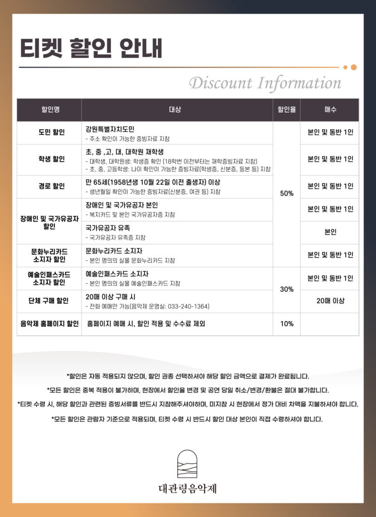 (ex,음악제 홈페이지 예약 - 강원도민 할인 = 예매 수수료없이 50%할인 적용)