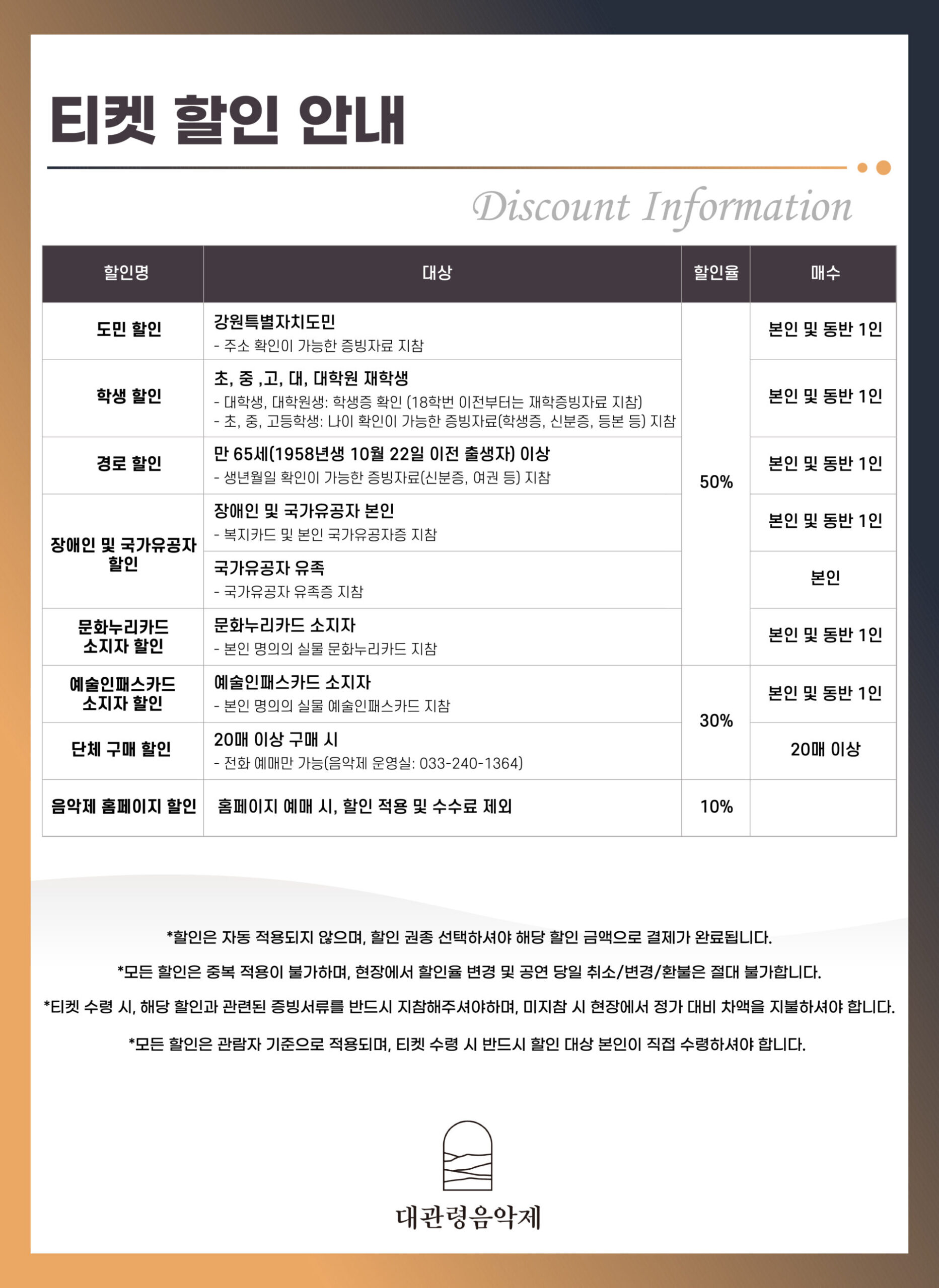 ?tip– 대관령음악제와 인터파크 티켓 판매좌석이 연동되어 판매되며대관령음악제 홈페이지 및 모바일 예매시 수수료가 발생하지 않습니다!