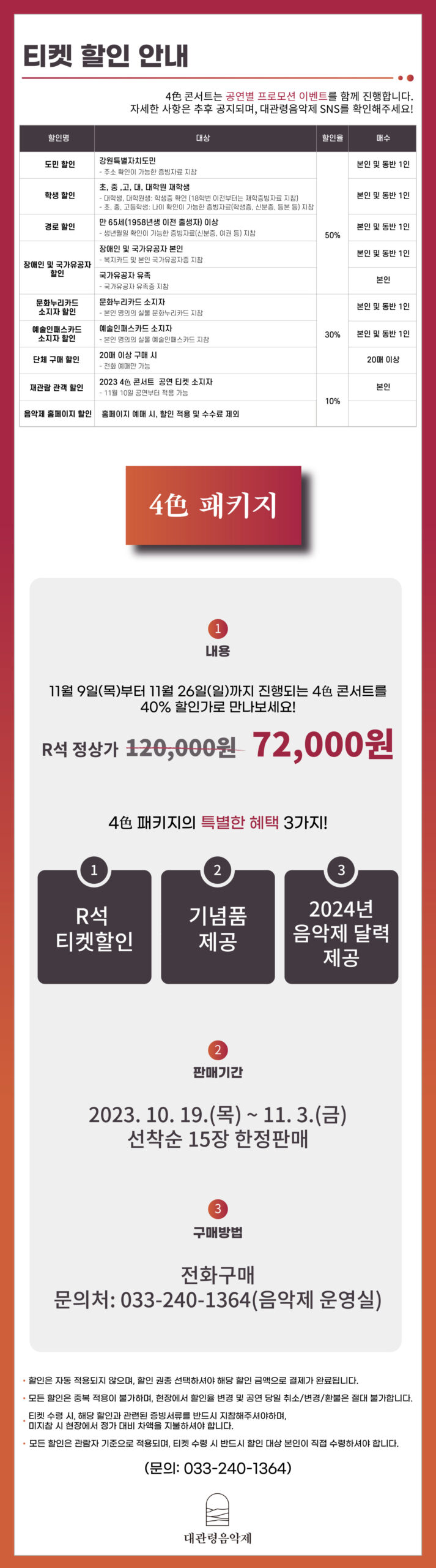 (ex. 음악제 홈페이지 예약 – 강원도민 할인 = 예매 수수료없이 50%할인 적용)