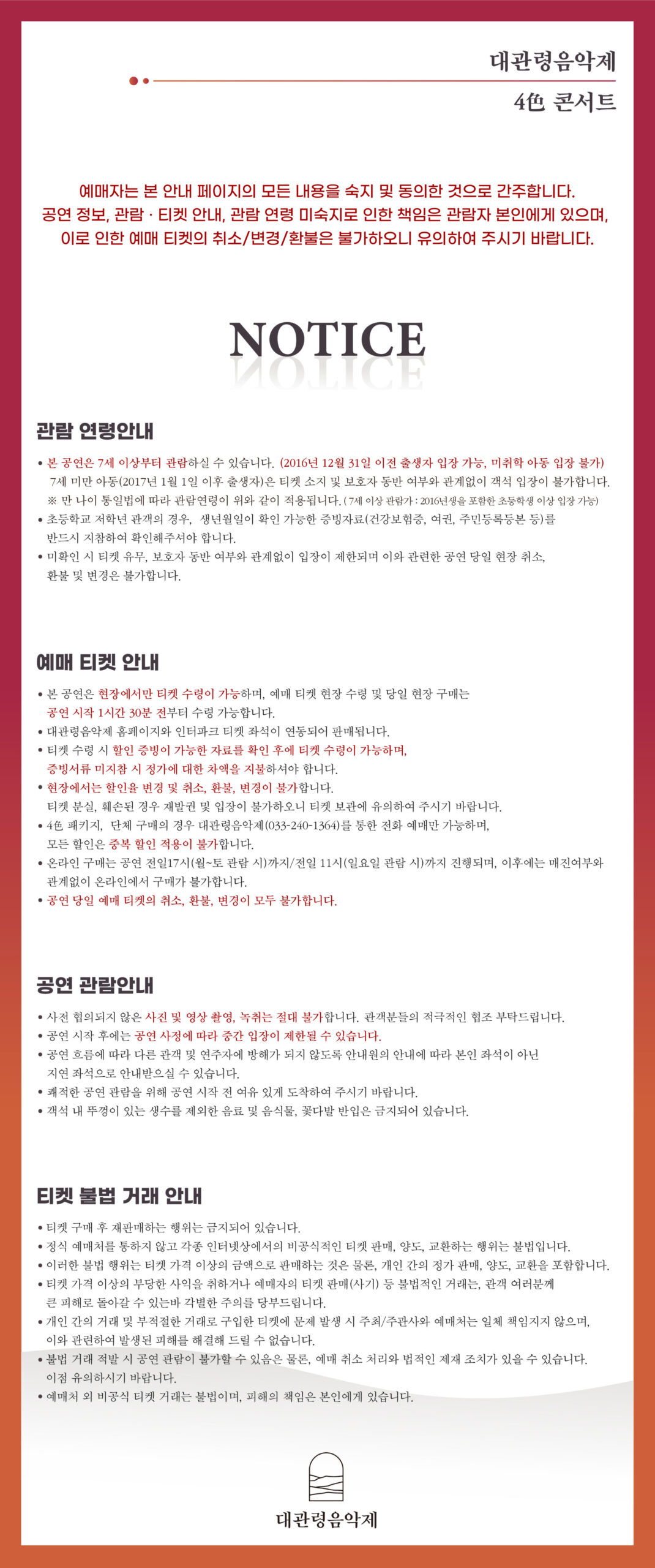자세한 내용은 하단 정보를 확인하시고, 보다 쾌적한 공연 관람 되시길 바랍니다.4色 콘서트와 함께 올 한해도 즐겁게 마무리해보세요~~?